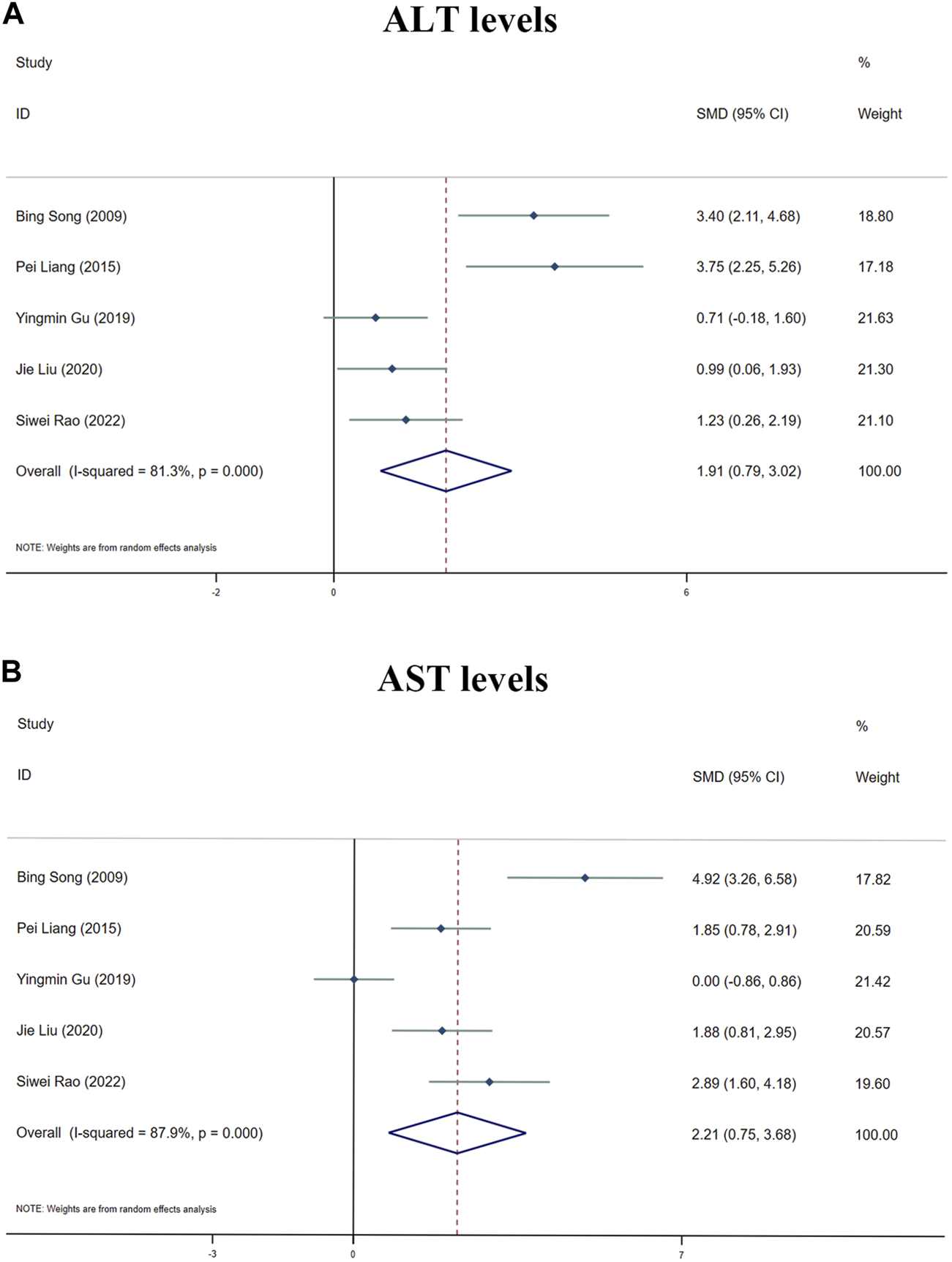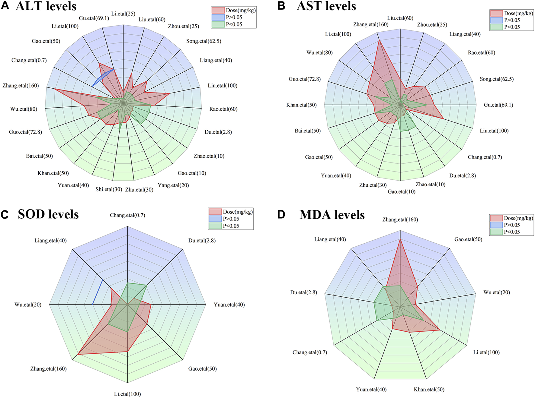 Research of hepatotoxicity needs to meet the following requirements: 1) Subjects: the study involved rats or mice as the population. 2) C group and I group: each study included at least 1 LI group as the C group and 1 MT group as the I group. 3). The I groups were comprised of normal animals and received MT monotherapy exclusively. The C groups consisted of normal animals that either received no treatment or received non-functional intervention. 4) The indicators of the studies should encompass AST and ALT, either in their entirety or partially. 5) The quality evaluation results were above 5 points.