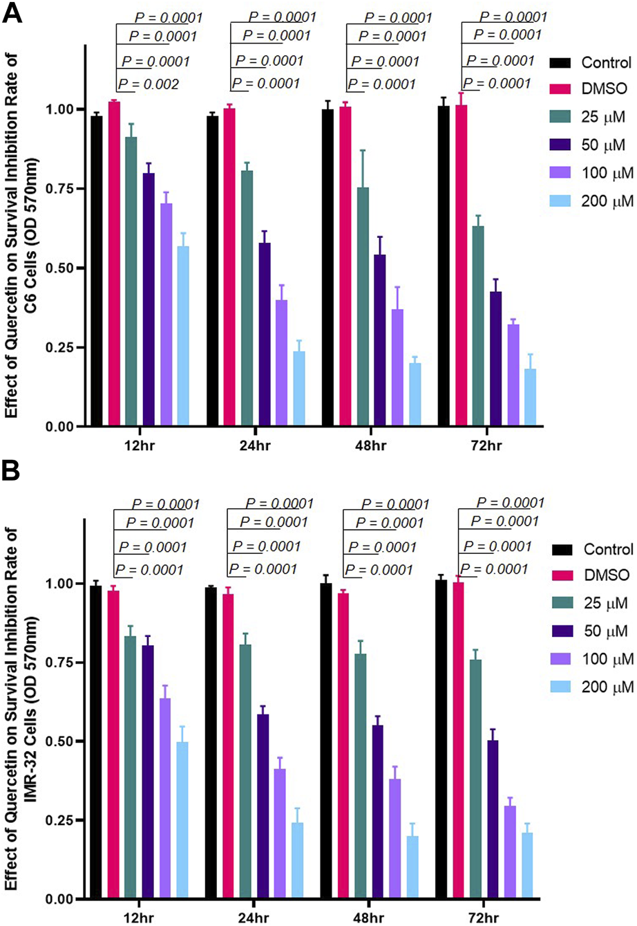 Quercetin treatment inhibits the proliferation of neuronal cells. Cells were incubated with different concentrations of quercetin (25 μM, 50 μM, 100 μM, and 200 µM) for 12, 24, 48, or 72 h, respectively. Control comprised cells without quercetin treatment. (A) Bar graph showing the effect of quercetin on rat glioma C6 cells in a concentration- and time-dependent manner. (B) Bar graph showing the effect of quercetin on human neuroblastoma IMR-32 cells in a concentration- and time-dependent manner. The data shown represent the mean ± standard deviation of three biological replicates. The statistical analysis was carried out using one-way ANOVA with multiple comparisons using Dunnett’s post hoc test to determine the level of significance. **p < 0.01; *** p < 0.0001.