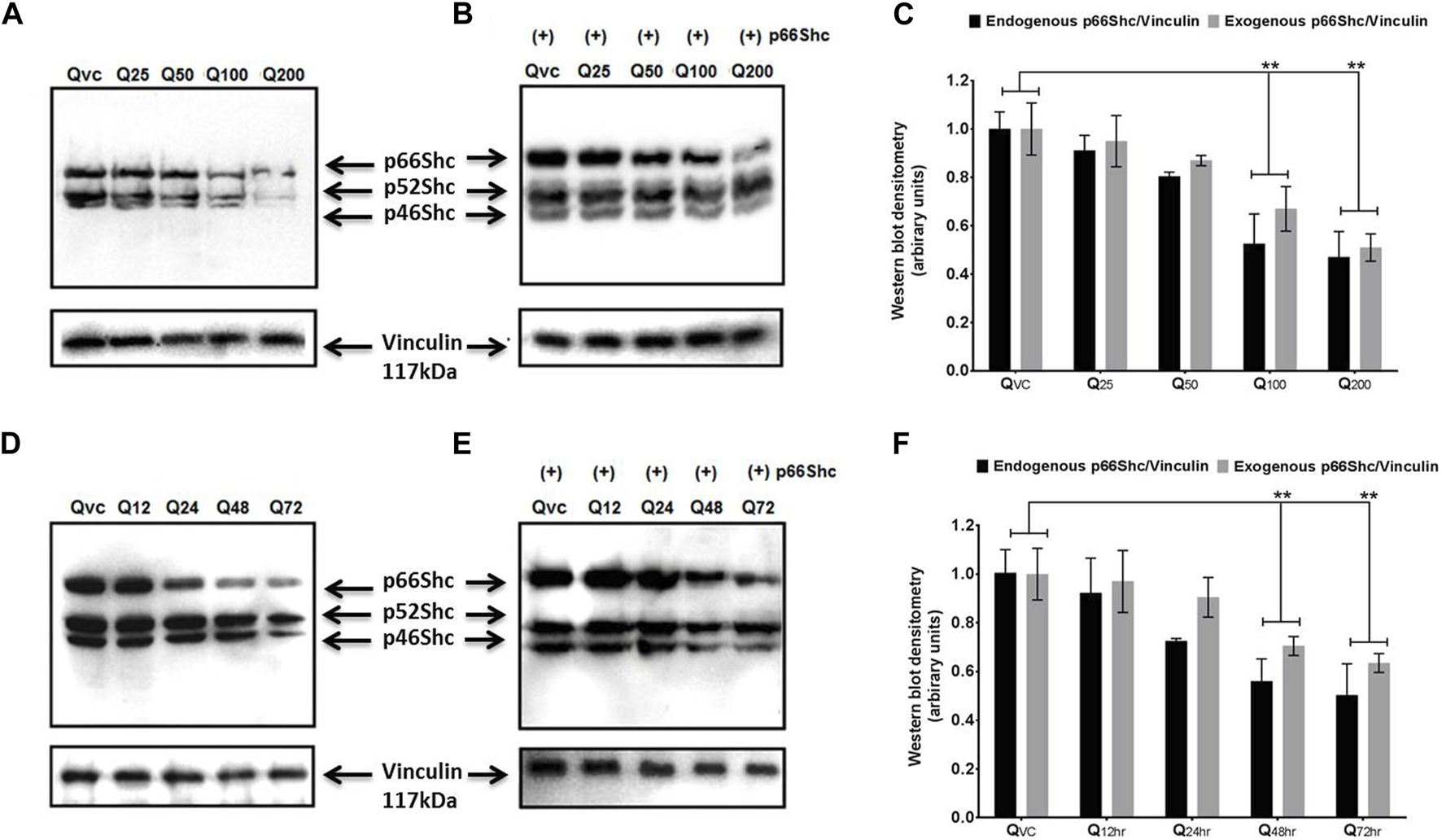Quercetin decreases the expression levels of p66Shc. (A) Representative immunoblot showing the dose-dependent effect of quercetin for 24 h on endogenous p66Shc. (B) Immunoblot showing the effect of quercetin for 24 h on exogenous (+) p66Shc (externally transfected) in C6 cells. (C) Bar diagram (densitometric analysis) showing the fold change in the expression levels of endogenous and exogenous p66Shc in response to quercetin treatment. (D) Immunoblot showing the time-dependent effect of quercetin on the endogenous expression of p66Shc. (E) Immunoblot showing the time-dependent effect of quercetin on exogenous (+) p66Shc expression in cells treated with 100 µM quercetin. Also detected in the blot are two other Shc isoforms, i.e., p52Shc and p46Shc. QVC: vehicle control. Q25–Q200: 25 µM–200 µM concentrations of quercetin used. Q12 hr–Q 72 h: 100 µM concentration of quercetin used for 12 h–72 h. Lower panels represent the expression of vinculin protein used as loading control, in respective treatment groups. (F) Bar diagram densitometric analysis showing the fold change in the expression of p66shc in response to quercetin in a time-dependent manner. The results shown were repeated at least three times and are expressed as mean ± SD fold change over the control level set to 1 unit and normalized to total protein. The statistical analysis was carried out using one-way ANOVA with multiple comparisons using Dunnett’s post hoc test. **p < 0.01 represents significant variation compared to respective vehicle controls.