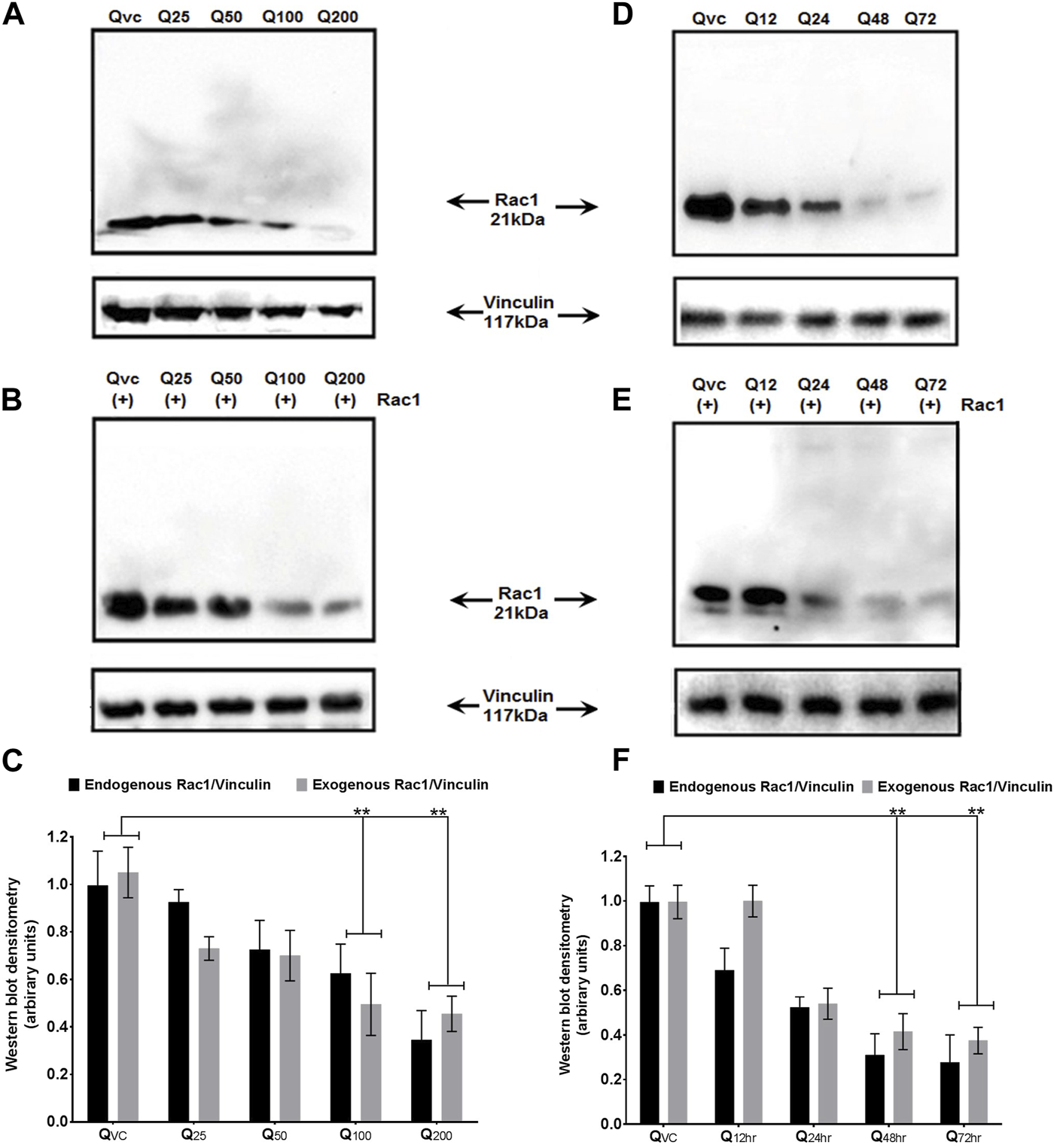 Effect of quercetin on the expression of Rac1 protein. (A) Western blot immunoblot showing a dose-dependent effect of quercetin on endogenous Rac1 at different time points in C6 glioma cells. (B) Western blot immunoblot showing a dose-dependent effect of quercetin on exogenous Rac1 at different time points in C6 glioma cells. (C) Bar diagram (densitometric analysis) showing the fold change in the expression levels of endogenous and exogenous Rac1 in response to quercetin treatment in a concentration-dependent manner. (D) Immunoblots showing the time-dependent effect of quercetin on the expression levels of endogenous Rac1 in C6 glioma cells and harvested after 24 h. (E) Immunoblots showing the time-dependent effect of quercetin on the expression levels of exogenous Rac1 in C6 glioma cells harvested after 24 h. QVC: vehicle control. Q25–Q200: 25 µM–200 µM concentrations of quercetin used. Q12 hr–Q72 h: 100 µM concentration of quercetin used for 12 hr–72 h. Lower panels represent the expression of vinculin protein used as loading control, in respective treatment groups. (F) Bar diagram (densitometric analysis) showing the fold change in the expression levels of endogenous and exogenous Rac1 in response to quercetin treatment in a time-dependent manner. The results shown were repeated at least three times and are expressed as mean ± SD fold change over the control level set to 1 unit and normalized to total protein. The statistical analysis was carried out using one-way ANOVA with multiple comparisons using Dunnett’s post hoc test. **p < 0.01 represents significant variation compared to respective vehicle controls.