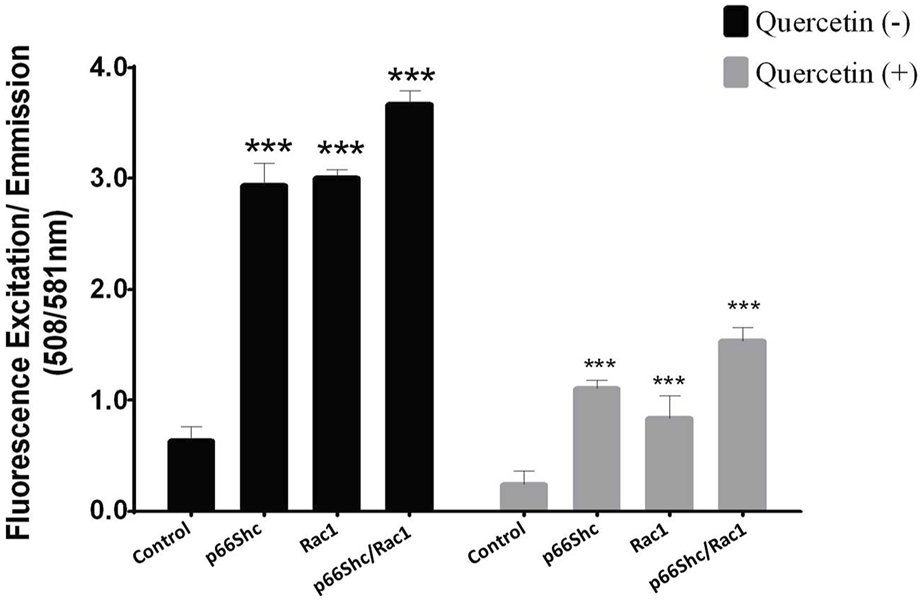 Both p66Shc and Rac1 are known to be involved in ROS generation and the regulation of cellular oxidative stress; hence, the effect of quercetin on ROS production via the p66Shc–Rac1 pathway was studied. Cells were transiently transfected with (i) p66Shc, (ii) Rac1, and/or (iii) p66Shc and Rac1 together. The Amplex UltraRed reagent was used to monitor extracellular ROS generation in C6 glioma cells, following quercetin treatment. The overexpression of p66Shc and/or Rac1 in cells resulted in a significant increase in ROS generation, which showed a peak when both the vectors were expressed together. However, the treatment of cells with quercetin not only reduced the levels of ROS (Figure 4) but also showed a significant inhibition of p66Shc/Rac1, irrespective of whether both the vectors are co-expressed or not.