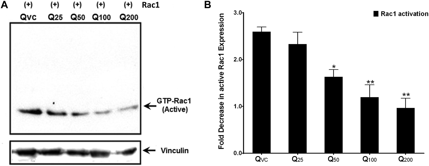 Quercetin decreases active Rac1 levels in c6 cells. (A) Representative immunoblot showing a decrease in active Rac1 levels upon quercetin treatment in immuno-precipitated lysates from C6 cells transiently transfected with the Rac1 plasmid construct. (B) Western densitometry quantifications showing fold decrease in active Rac1 upon quercetin treatment compared to control (untreated). The results shown were repeated at least three times and are expressed as mean ± SD. The statistical analysis was carried out using one-way ANOVA with multiple comparisons using Dunnett’s post hoc test. *p < 0.05, **p < 0.01, and ***p < 0.00 represent significant variations compared to respective vehicle controls.