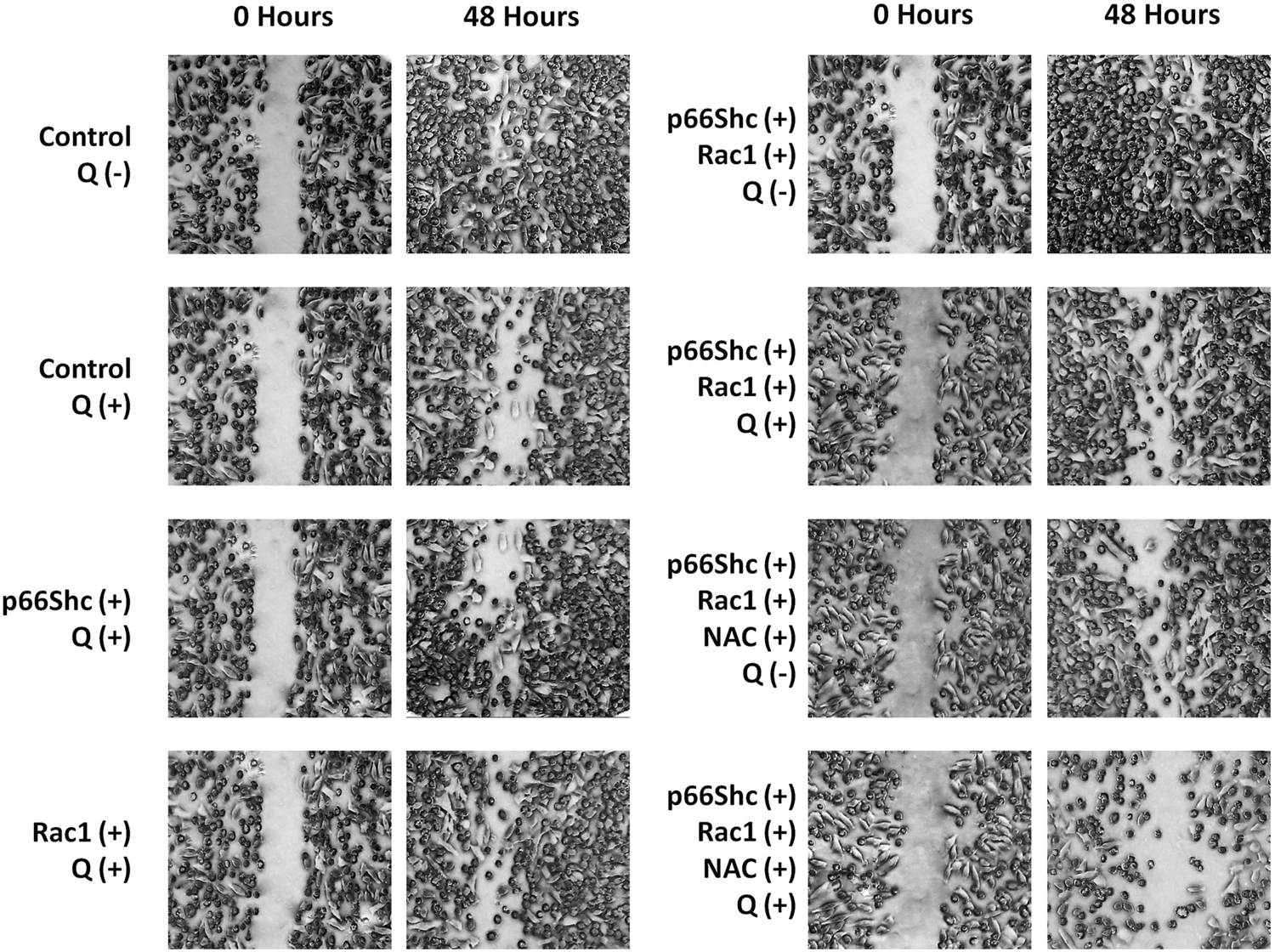 The effect of quercetin on the migratory potential of C6 cells was determined using wound-healing assay. In brief, the cells were seeded in a 24-well plate at a density of 1 × 105 cells per well. At 70%–80% confluence, the cells were transfected with either p66Shc or Rac1 or both the plasmids together. A P-10 pipette tip was used to create a clean wound area across the center of the culture plate. The cells were then treated with 100 µM quercetin or 1 mM NAC; however, control cells were left untreated. The movement of the cells in the area of the wound was examined. The images of the distance migrated by the cells were taken under a light microscope (Olympus).