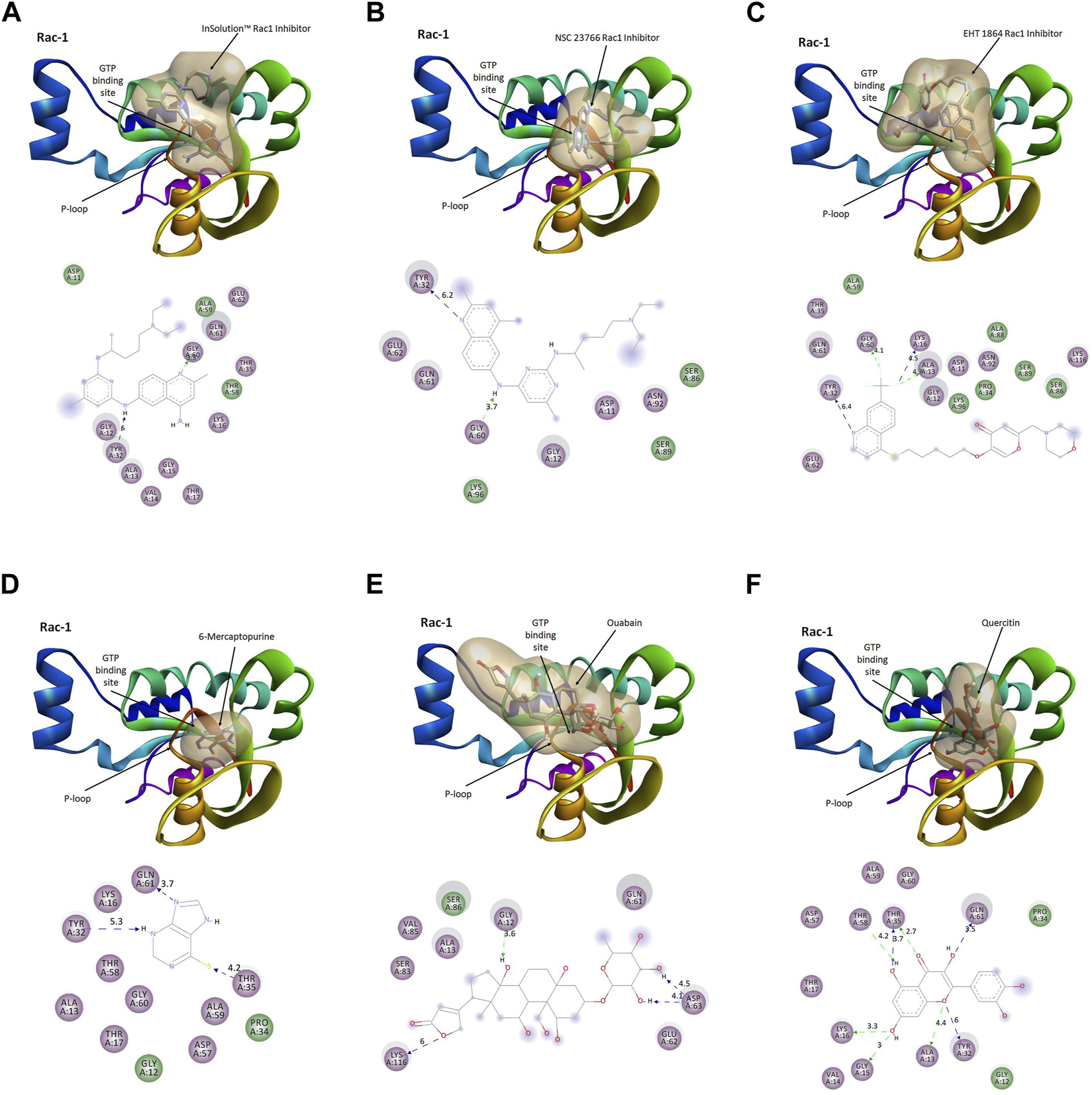 Comparative binding modes of Rac1 inhibitors and quercetin. The results of the molecular docking simulation of Rac1 protein with (A) InSolution™ Rac1 Inhibitor, (B) NSC 23766, (C) EHT 1864, (D) 6-mercaptopurine, (E) ouabain, and (F) quercetin showing respective binding modes of inhibitors targeting the GTP-binding site. Ligand interactions at the GTP-binding site of Rac1 are depicted in molecular models.