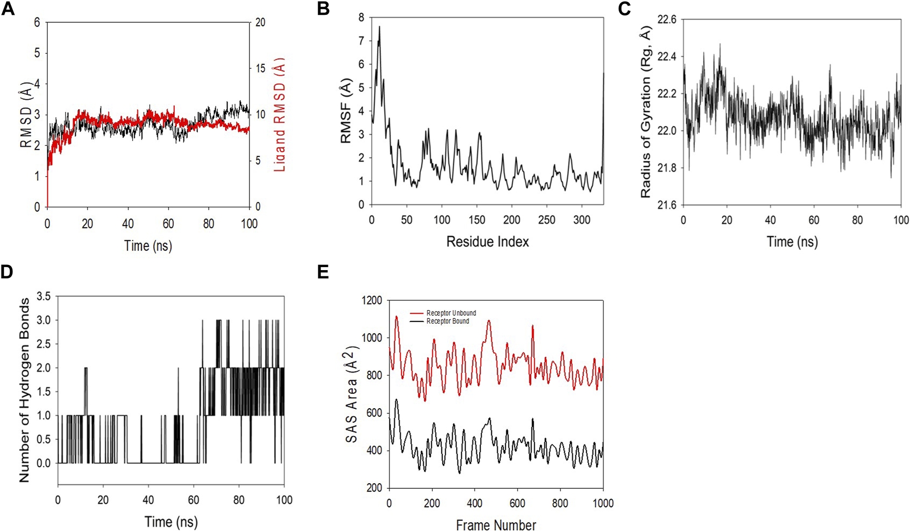MD simulation analysis of the 100 ns trajectories of (A) the Cα backbone RMSD of 3TH5 bound to ligand quercetin. (B) RMSF of the Cα backbone of 3TH5 bound to ligand quercetin. (C) Cα backbone radius of gyration (Rg) of 3TH5 bound to ligand quercetin. (D) Formation of hydrogen bonds in 3TH5 bound to ligand quercetin. (E) Solvent-accessible surface area of 3TH5 bound to ligand quercetin.