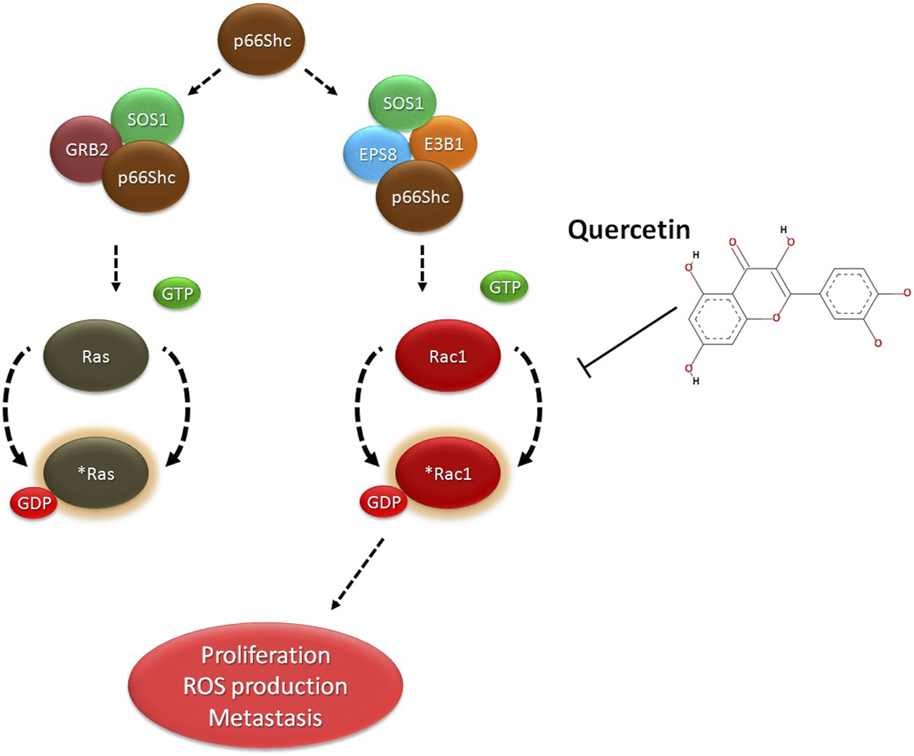 Proposed model of quercetin action: Quercetin binds to Rac1 and decreases cell migration and cell proliferation by inhibiting p66Shc mediated activation of Rac1 and ROS production.