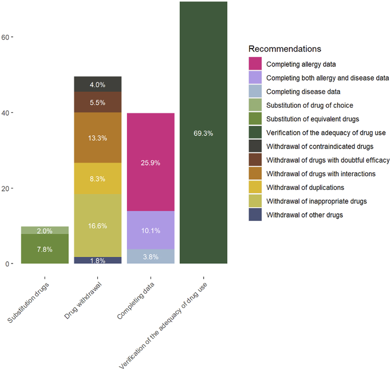 From the identified problems during the medication review, different recommendations were given. These recommendations could be to complete absent data, withdraw a drug, verify whether the use of a drug was adequate, or substitute a drug. As for the missing data, allergies or diseases could be absent. As for the withdrawal of drugs, this was recommended when MRPs were considered, such as potential DDIs, duplicated therapies, contraindicated drugs, inappropriate drugs, or drugs of doubtful efficacy. As for the adequacy of drug use, this could be due to the need to reduce the dose, a bad tolerance, to reduce anticholinergic load, or a high risk of ADRs. As for the substitution of a drug, this could be recommended due to considering other drugs as a first choice or equivalent drugs.