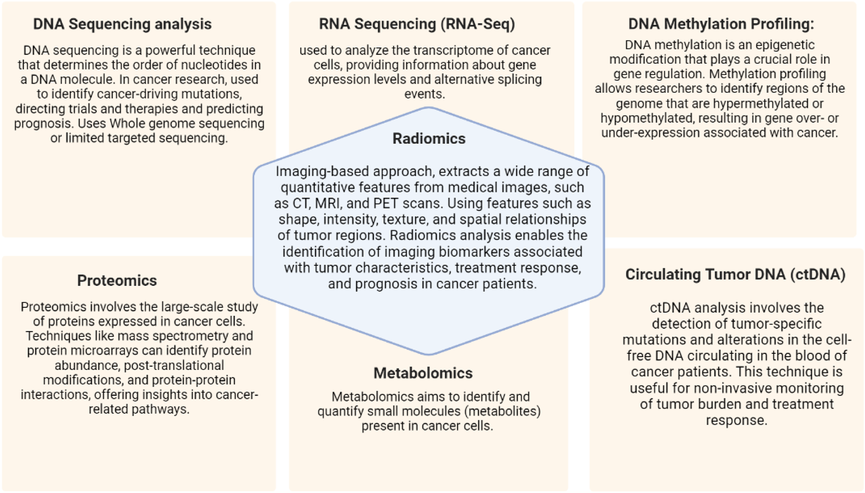 Cancer is a challenging and heterogeneous pathology that is triggered by genetic and molecular changes that impair regular cellular functions and cause unchecked cell growth and proliferation. For the purpose of improving cancer research, diagnostic, and treatment methods, it is crucial to comprehend the molecular environment of cancer cells. The development of comprehensive molecular profiling tools has advanced significantly over the past two decades, revolutionizing our ability to identify the genomic, transcriptomic, epigenomic, and proteomic changes found in cancer cells (Figure 3). Using previous data points precision medicine has also been able to identify radiomic response of certain molecular mutations inherent in some populations of cancer, easing both the load on patient and healthcare providers (Rosario et al., 2018).