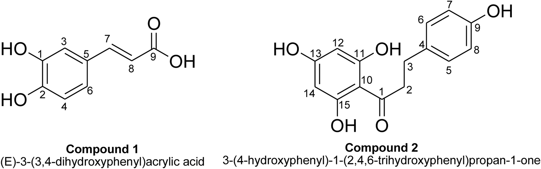 Fractionation was performed by adding 500 ml of distilled water to the crude methanolic extract in a separating funnel, followed by the addition of chloroform (500 ml). It was shaken at different intervals and allowed to stand to obtain two distinct layers. The same process was repeated three times for the separation of chloroform. The collected chloroform was concentrated using a rotary evaporator at reduced pressure. A semi-solid form of the chloroform extract, weighing 44 g, was obtained. Fractionation was done based on increasing polarity. As per our earlier work, we subjected the chloroform fraction to column-based chromatography for the separation of phytochemicals. We investigated the elution of compounds from the selected fraction on pre-coated silica gel TLC plates via the rising polarity elusion approaches. We started the chromatographic method with simply pure n-hexane initially and then slowly increased the polarity via the addition of 2% ethyl acetate each time. After each addition of ethyl acetate, TLC was visualized, and the polarity was adjusted correspondingly. Then, depending on the amount of fractions, we took a large column packed with flash silica slurry with a suitable fraction. Elution started with that of the non-polar n-hexane and gradually rose in polarity with ethyl acetate. Partially pure fractions, approximately up to 80%, were produced. Then, this was again loaded to pencil columns. The columns were once again eluted with n-hexane and chloroform solvent solutions for targeted component purification. The phytochemicals (1 and 2) were extracted from the chloroform bioactive fraction. Compounds 1 and 2 were purified, yielding 251 mg and 277 mg, respectively (Ayaz et al., 2014a; Ayaz et al., 2014b).