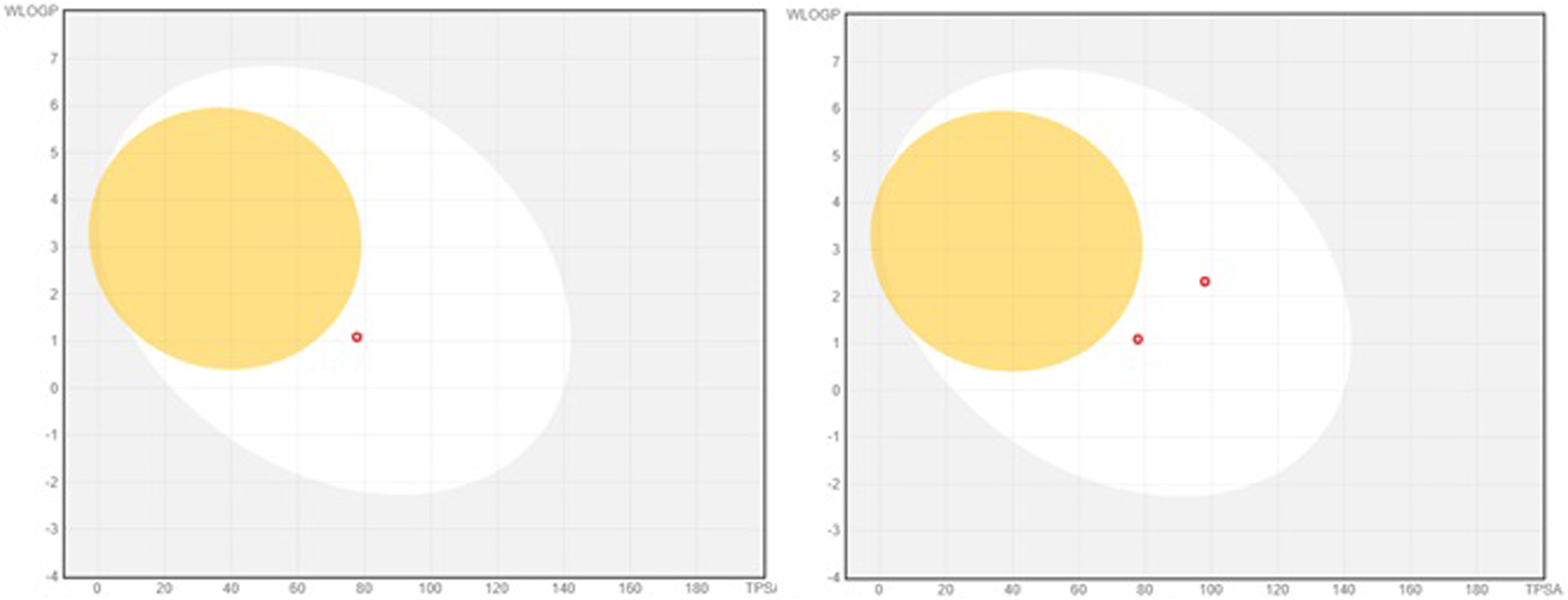 The concept of drug-like chemical space plays a key role in the development and selection of potential drug candidates. It refers to compounds possessing pharmacokinetic potentials suitable for successfully navigating human Phase I clinical trials (Bade et al., 2010). The physicochemical properties, water solubility, lipophilicity, pharmacokinetic profile, and medicinal chemistry of the compounds were predicted using the SwissADME database (Daina et al., 2017; Ahmad et al., 2021a). The database contained 2D structures that enabled the use of a string-based search. The simplified molecular-input line-entry system (SMILES) was used to represent the structures of various ligands.