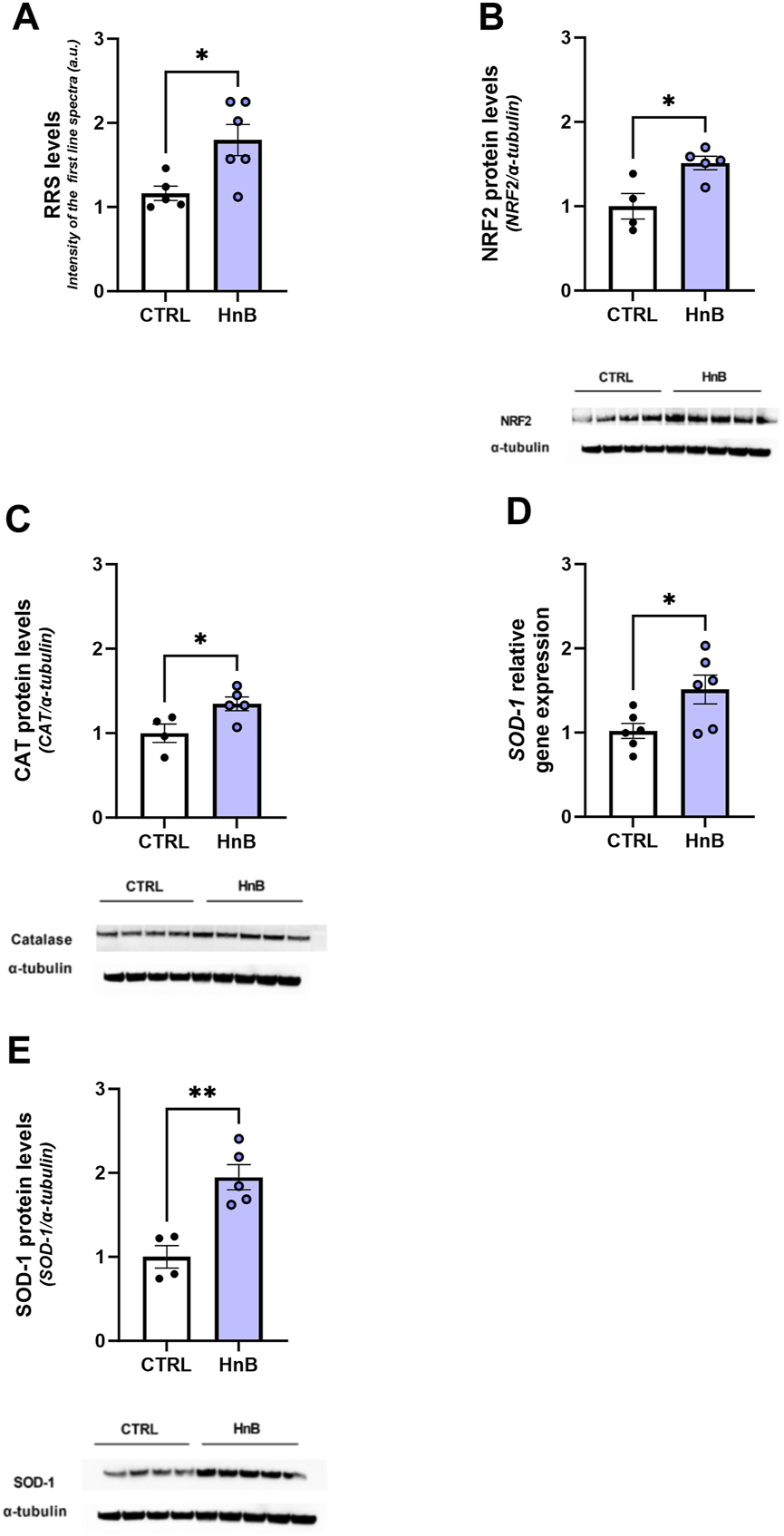 HnB exposure leads to oxidative stress and induces the NRF2-mediated antioxidant response. Radical species content, here measured through the intensity of the first spectral line of electronic paramagnetic resonance (EPR) (arbitrary units), is significantly higher in samples from exposed animals compared to those from controls (A). HnB group showed a significant increase in NRF2 (∼65 kDa) (B), with an upregulation of CAT (∼55 kDa) (C) and SOD-1, here shown as a relative gene expression (D) and protein expression (∼19 kDa) (E). A representative blot is reported under the histograms. Bars represent the means ± SEM; *p < 0.05, **p < 0.01; two-tailed t-test.