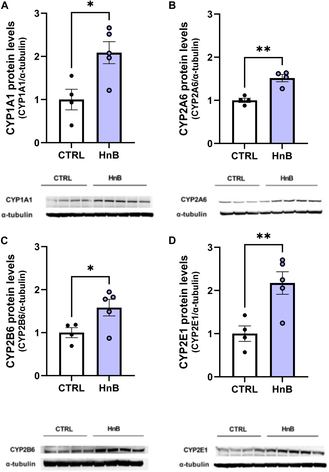 HnB exposure induces the expression of CYPs. The exposure to HnB smoke led to an overexpression of CYP1A1 (∼63 kDa) activating aromatic amines, dioxins, and PAHs (A). CYP2A6 (∼56 kDa) (involved in metabolic activation of carcinogenic nitrosamines in tobacco smoke as well as nicotine metabolism); (B); CYP2B6 (∼66 kDa) (activating bupropion smoking-cessation drug); (C) and CYP2E1 (∼50 kDa) (activating alcohol, nitrosamines, benzene, acetone, and acrylamide) (D). A representative blot is reported under the histograms. Bars represent the means ± SEM; *p < 0.05, **p < 0.01; two-tailed t-test.