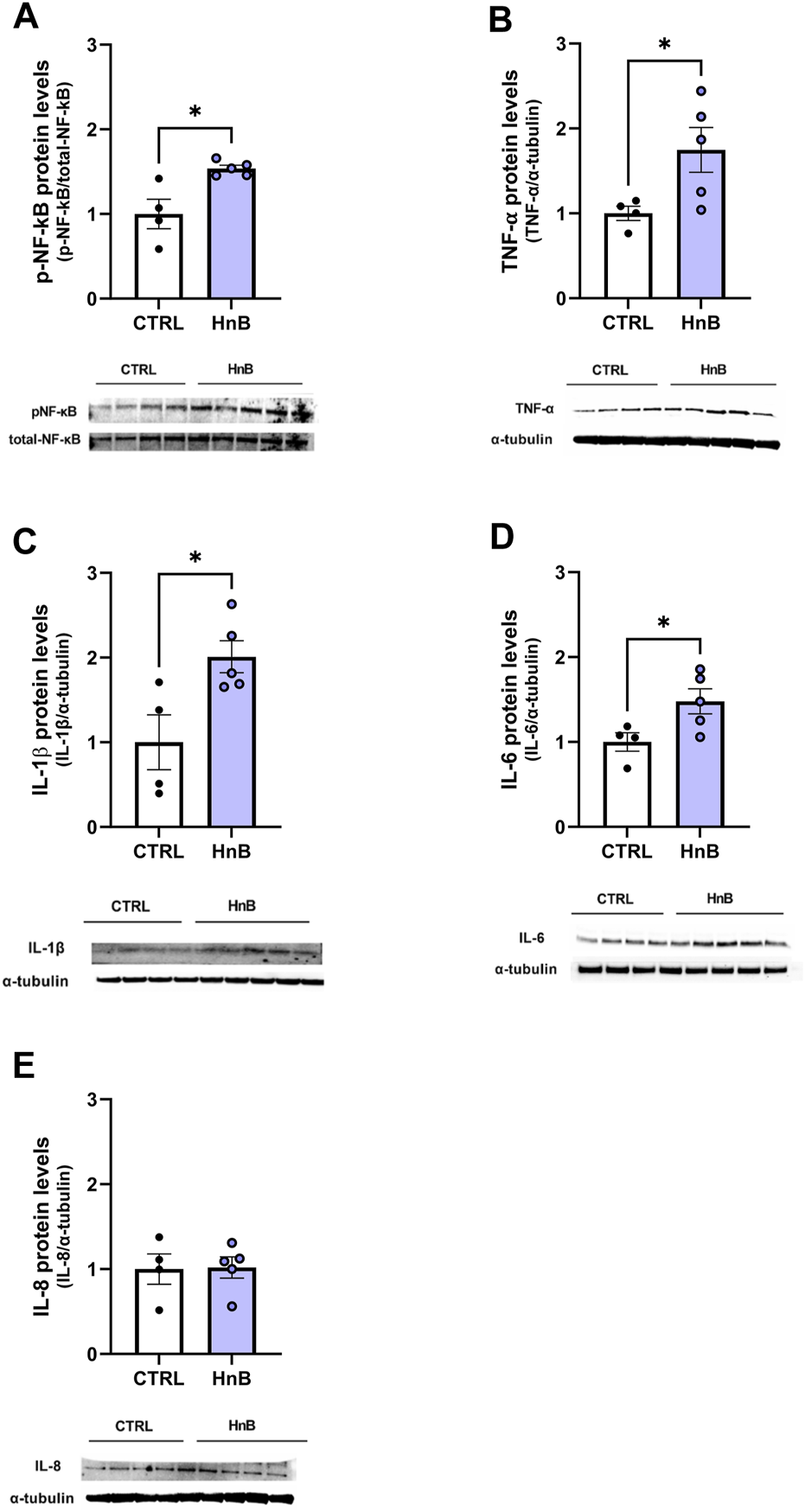 HnB activates NF-κB-mediated inflammatory response. Exposed animals reported an increase in phosphorylation of NF-κB (p65 Ser 536) (∼61 kDa) (A), along with the upregulation of TNF-α (∼25 kDa) (B), IL-1β (∼17 kDa) (C), and IL-6 (∼26 kDa) (D). On the contrary, no significant changes in IL-8 (∼11 kDa) (E) expression were observed. A representative blot is reported under the histograms. Bars represent the means ± SEM; *p < 0.05; two-tailed t-test.