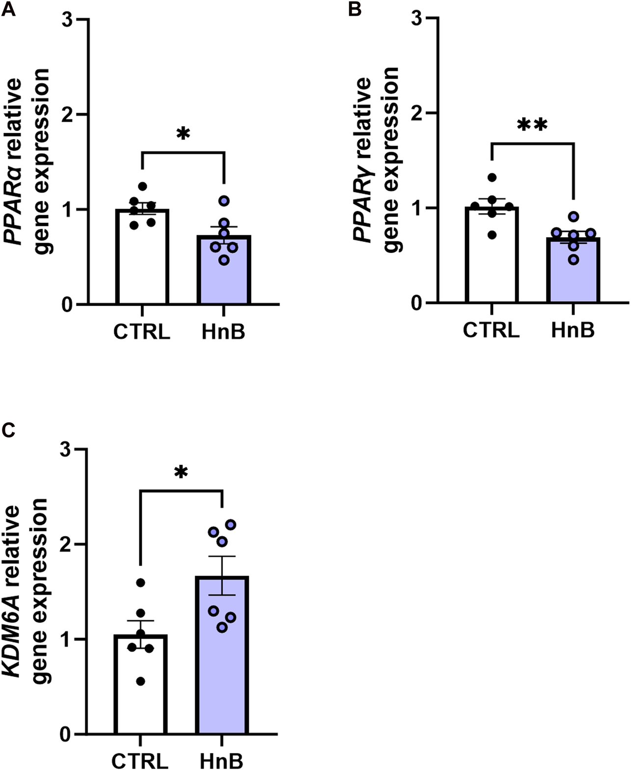 Effects of the HnB mainstream on the relative gene expression of KDM6A (A), PPARα (B), and PPARγ (C) in the rat PFC. Data represent 2−ΔΔCT values calculated using the ΔΔCT method and are expressed as the means ± SEM; *p < 0.05; **p < 0.01, two-tailed t-test.