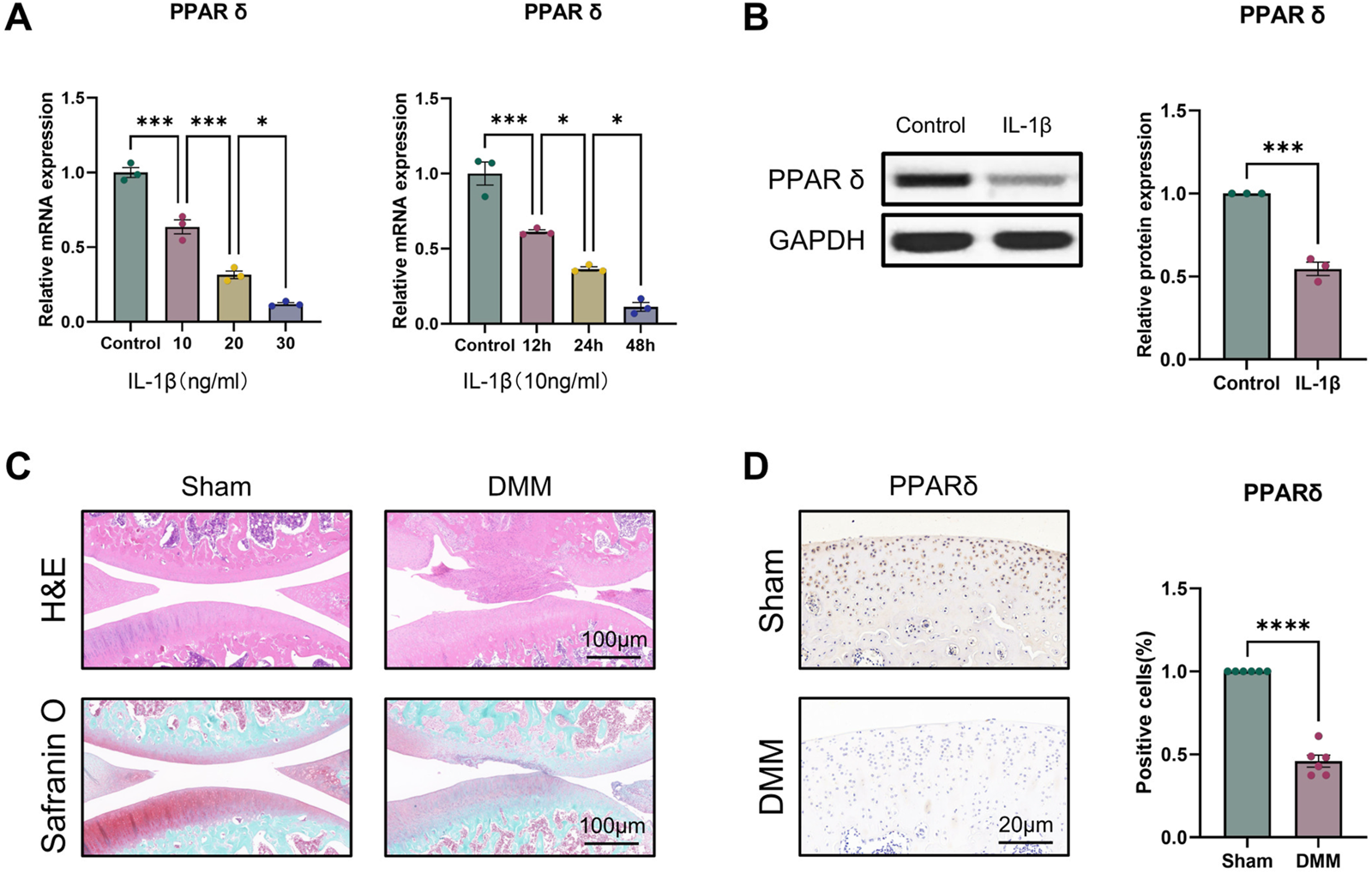 PPARδ expression is decreased in IL-1β-induced OA chondrocytes. (A) Quantitative real-time PCR assessment of PPARδ expression after treatment of rat primary chondrocytes with different concentrations of IL-1β at different time points. (n = 3) *p < 0.05, ***p < 0.001. (B) The expression of PPARδ in rat chondrocytes was assessed using Western blot. (n = 3) ***p < 0.001. (C) Safranin O staining, H&E staining, and (D) immunohistochemical staining of rat knee joints. (n = 6) ****p < 0.001.