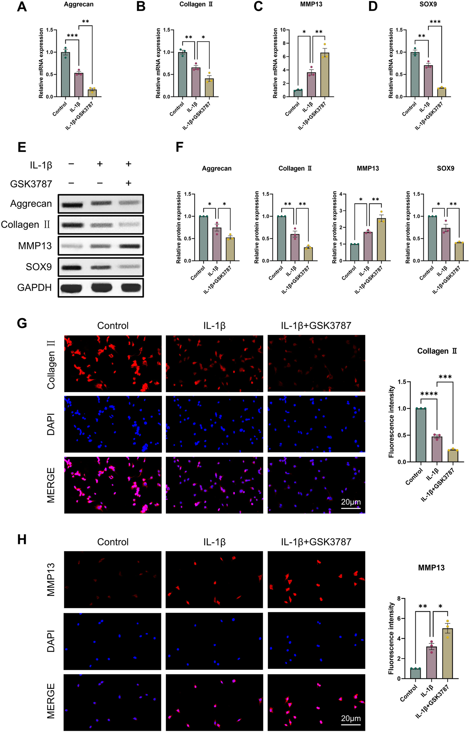 Antagonizing PPARδ activation promotes IL-1β-induced cartilage ECM degradation. Chondrocytes were treated with PPARδ antagonist (GSK3787) and/or IL-1β. (A–D) Quantitative real-time PCR analysis of Aggrecan, Collagen II, MMP13 and SOX9 in rat chondrocytes using GAPDH as an endogenous control. (E, F) Protein expression of Aggrecan, Collagen II, MMP13, SOX9 in rat articular chondrocytes was assessed by Western blot with GAPDH as an endogenous reference and its quantification by ImageJ. (G, H) Immunofluorescence staining results of Collagen II and MMP13 in rat chondrocytes (bar:20 μm). All data are expressed as mean ± SD (n = 3); *p < 0.05, **p < 0.01, ***p < 0.001, ****p < 0.0001.