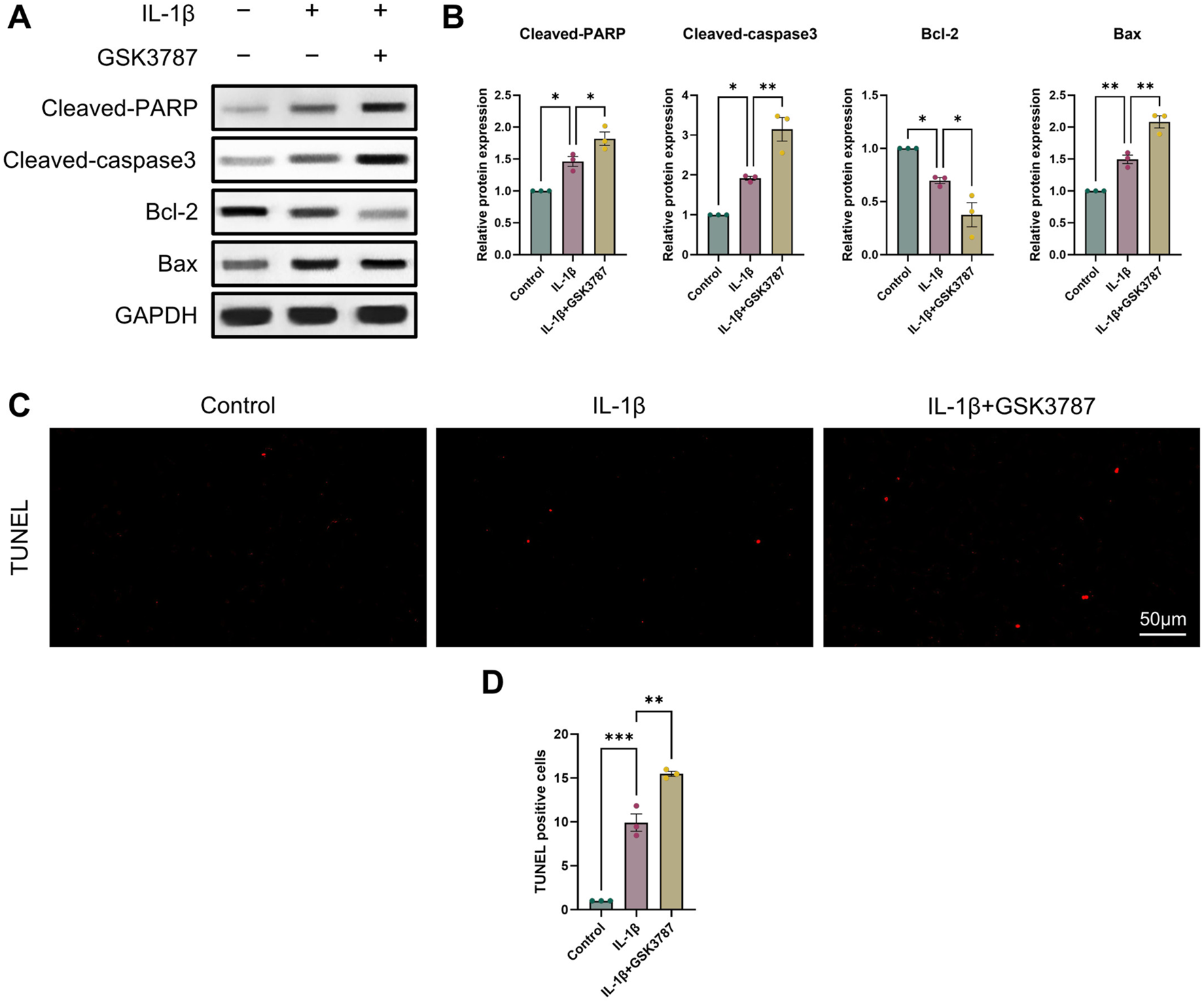 Antagonizing PPARδ activation promotes IL-1β-induced chondrocyte apoptosis. (A, B) Western blot and quantification of Cleaved-PARP, Cleaved-caspase3, Bcl-2, Bax expression in rat chondrocytes exposed to IL-1β or PPARδ antagonist (GSK3787) using ImageJ. (C, D) Chondrocyte apoptosis was assessed using TUNEL staining (bar:50 μm). All data are expressed as mean ± SD (n = 3); *p < 0.05, **p < 0.01, ***p < 0.001.