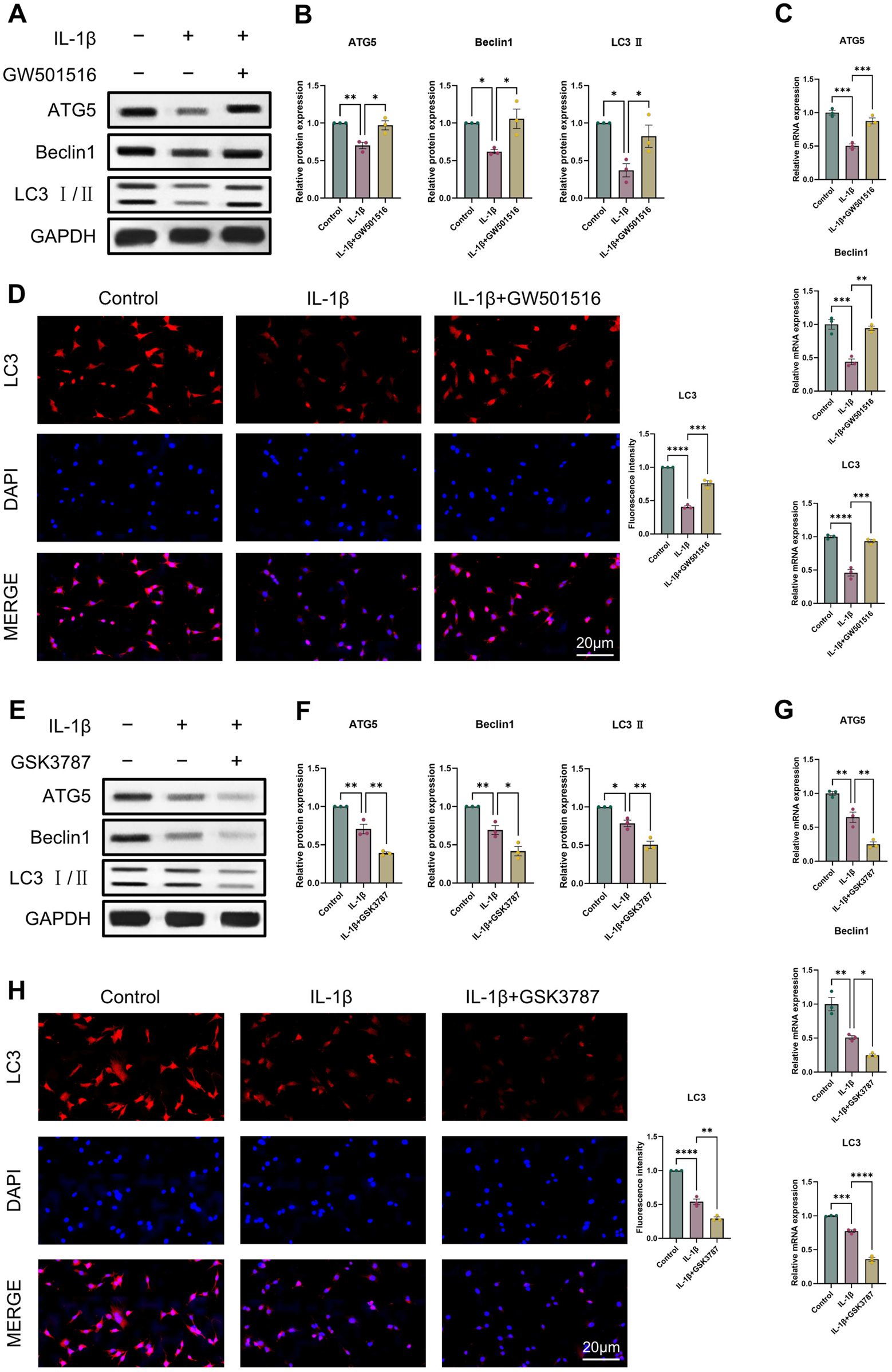 PPARδ regulates IL-1β-induced chondrocyte autophagy. (A, B) Western blot and quantification of ATG5, Beclin1 and LC3 Ⅱ expression in rat chondrocytes using ImageJ. (C) Quantitative real-time PCR analysis of ATG5, Beclin1 and LC3 in rat chondrocytes using GAPDH as an endogenous control. (D) Immunofluorescence staining results of LC3 in rat chondrocytes (bar:20 μm). Rat chondrocytes were pre-exposed to GSK3787 and subsequently treated with IL-1β (10 ng/mL) for 24 h. (E, F) Western blot and quantification of ATG5, Beclin1 and LC3 Ⅱ expression in rat chondrocytes using ImageJ. (G) Quantitative real-time PCR analysis of ATG5, Beclin1 and LC3 in rat chondrocytes using GAPDH as an endogenous control. (H) Immunofluorescence staining results of LC3 in rat chondrocytes (bar:20 μm). All data are expressed as mean ± SD (n = 3); *p < 0.05, **p < 0.01, ***p < 0.001, ****p < 0.0001.
