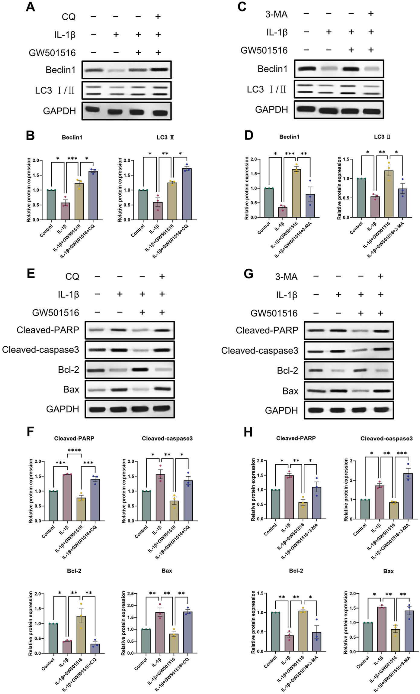 PPARδ activation increases the expression of genes associated to autophagy and reduces apoptosis in chondrocytes. (A–D) Chondrocytes were exposed to IL-1β, GW501516, CQ, 3-MA, Western blot as well as quantitative assessment the expression of Beclin1 and LC3 Ⅱ using GAPDH as an endogenous reference. (E–H) Chondrocytes were exposed to IL-1β, GW501516, CQ, 3-MA, Western blot as well as quantitative assessment the expression of Cleaved-PARP, Cleaved-caspase3, Bcl-2 and Bax using GAPDH as an endogenous reference. All data are expressed as mean ± SD (n = 3); *p < 0.05, **p < 0.01, ***p < 0.001.