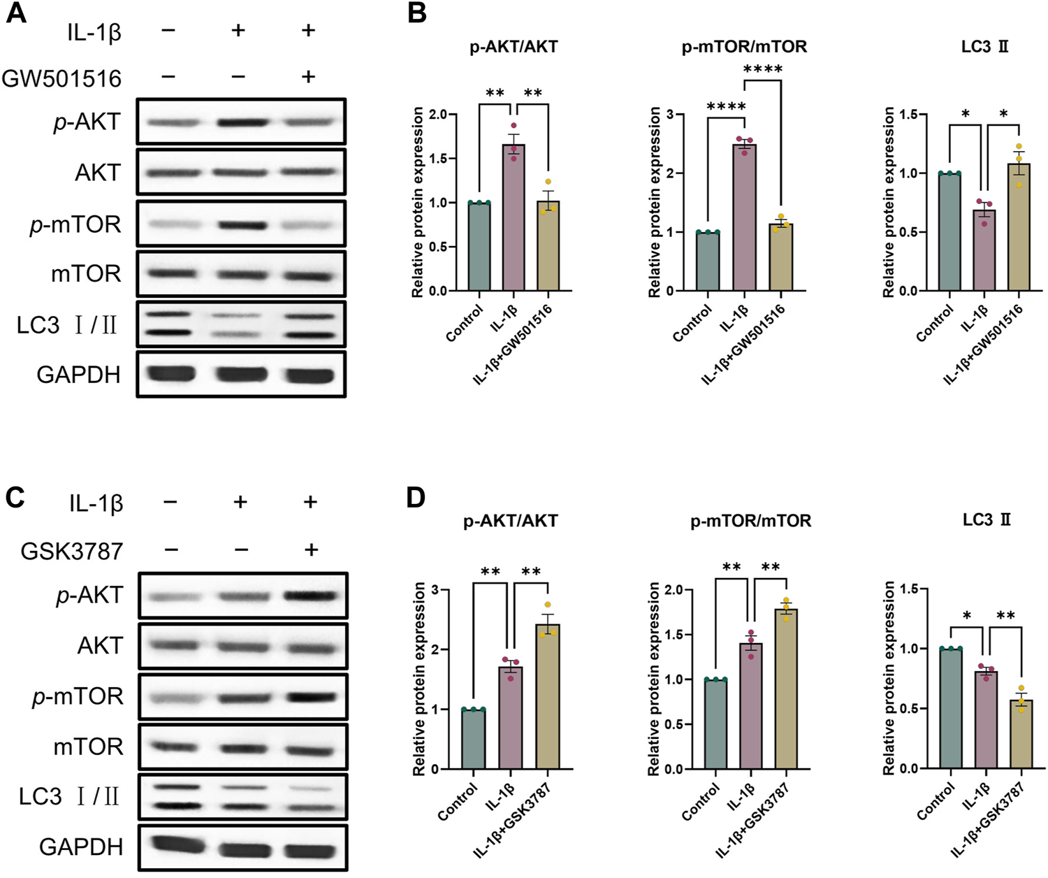 PPARδ induces autophagy through AKT/mTOR signaling pathway. (A, B) After the activation of PPARδ, the expression of p-AKT, AKT, p-mTOR, mTOR and LC3 II was quantitatively assessed using ImageJ with GAPDH as an endogenous reference. (C, D) After inhibition of PPARδ, the expression of p-AKT, AKT, p-mTOR, mTOR and LC3 II was quantitatively assessed using ImageJ with GAPDH as an endogenous reference. All data are expressed as mean ± SD (n = 3); *p < 0.05, **p < 0.01, ****p < 0.0001.