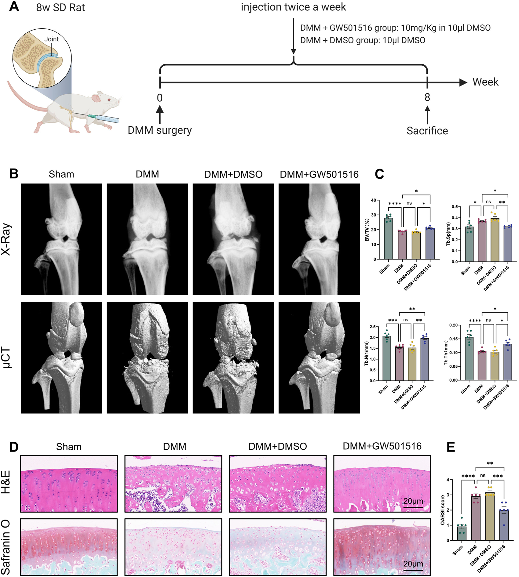 A total of twenty-four SD rats, aged 8 weeks, were obtained for the present study (Shanghai Bikay Koyi Biotechnology Co., Ltd., Shanghai, China). Briefly, the sample size for animal experiments was selected according to a well-designed experimental program, which was also authorized by Shanghai Ninth People’s Hospitals’ Ethics Committee (SH9H-2023-A834-1), and the OA rat model was established by DMM surgery as previously reported. Four groups were randomly assigned to these rats: Sham, DMM, DMM + DMSO, and DMM + GW501516. After anesthesia, the rats’ capsule was sliced medially to the patellar tendon, and microsurgical scissors were used to sever the medial meniscal ligament and meniscus. Rats in Sham also received arthrotomy, but the medial meniscal ligament was not removed. After DMM, the DMM + GW501516 group was injected intra-articularly with GW501516 dissolved in DMSO (10 mg/kg) twice a week. The same volume of DMSO was intra-articularly injected into the DMM + DMSO group. After surgery, they were placed in cages where they could move freely. The knee joints of the executed rats were removed after 8 weeks, followed by histological analysis.