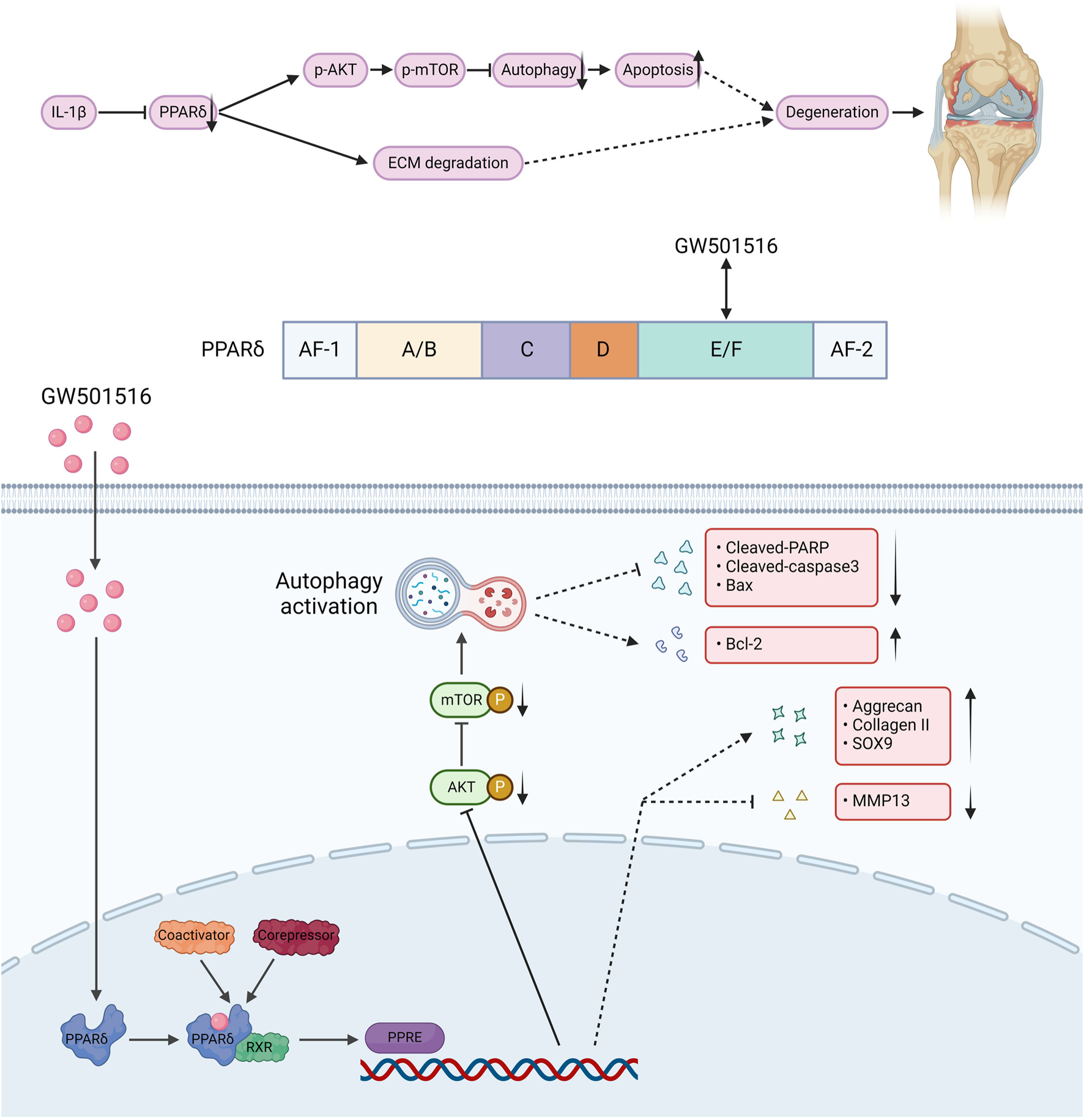 The structure of PPARδ and the site of action of GW501516. GW501516 attenuated ECM degradation through activation of PPARδ, In addition, PPARδ activation inhibits AKT/mTOR phosphorylation, which in turn activates autophagy and attenuates apoptosis, ultimately improving cartilage degeneration. A schematic chart drawn with BioRender.com.