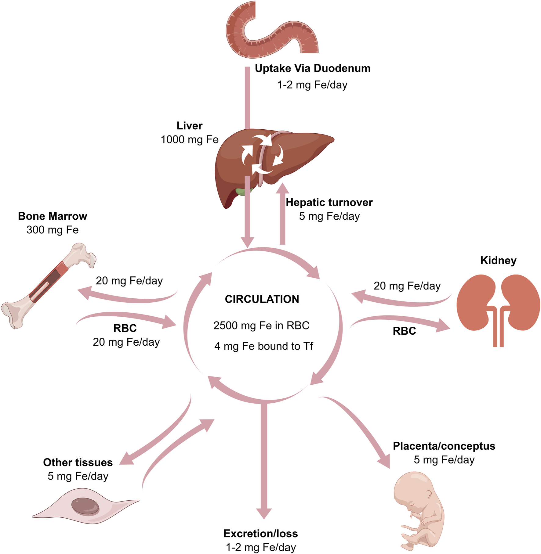 The relationships between the absorption, excretion, storage, placental, and bone marrow transport of iron.