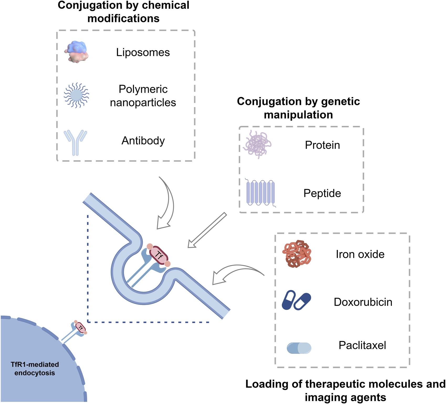 Tf as a protein-based delivery system for oncological therapeutics and imaging agents. Tf can be loaded with different drugs, imaging agents, liposomes, polymeric nanoparticles, inorganic nanoparticles and have intrinsic targeting capabilities toward the receptor TfR1, which is overexpressed in many tumors. Tf, Transferrin; TfR1, Transferrin receptor 1.