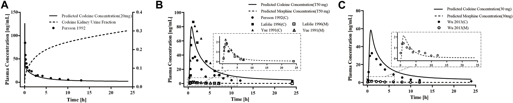 Figure 2. PBPK modeling established in healthy adults. Simulation (lines) of PK profiles for a single (A) i.v. administration of 20 mg of codeine and (B) p. o. administration of 50 mg of codeine tablet in a typical European individual, (C) p. o. administration of 30 mg of codeine tablet in a typical Asian individual. The observed concentration data were provided as the arithmetic mean values extracted from references. The solid and dotted lines represented the predicted codeine and morphine concentrations, respectively.