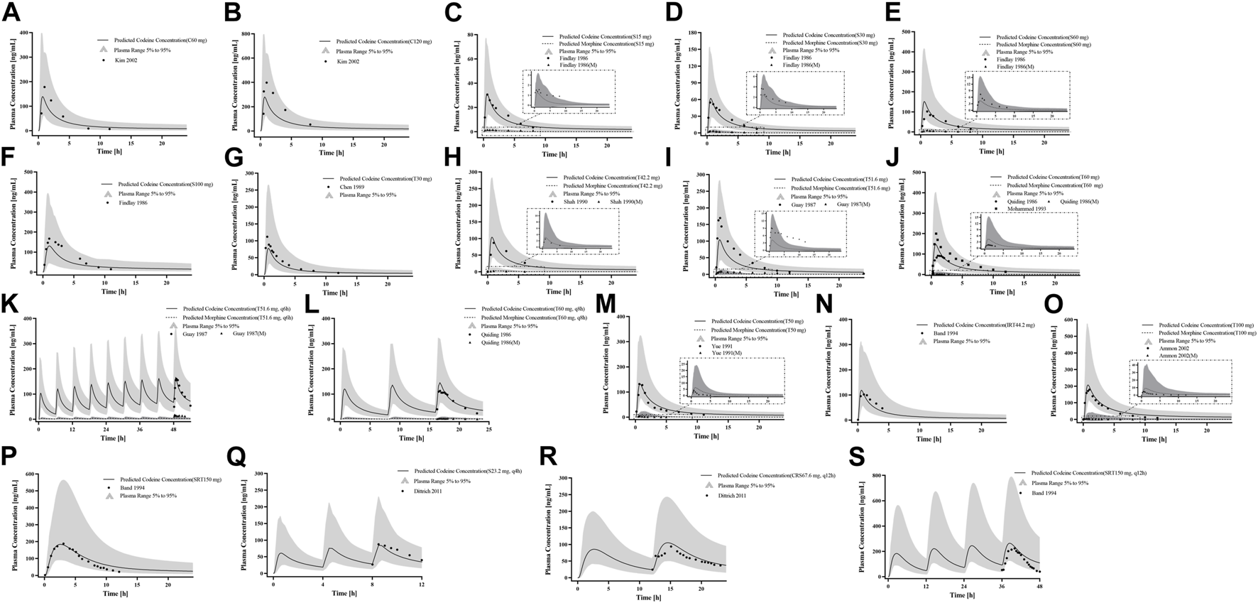 Figure 3. PK profile verification in healthy adults. (A, B) Single p. o. administration of codeine capsules in African Americans; (C–L) the p. o. administration at a dose or multiple doses of codeine in different formulations in White Americans; (M) the single p. o. administration of 50 mg codeine tablets in Asians; and (N–S) the p. o. administration at a dose or multiple doses of codeine in different formulations in Europeans. The observed concentration data were provided as the arithmetic mean values extracted from references. The solid and dotted lines represented the predicted codeine and morphine concentrations, respectively. The shaded area represented the predicted 5th to 95th percentile range.