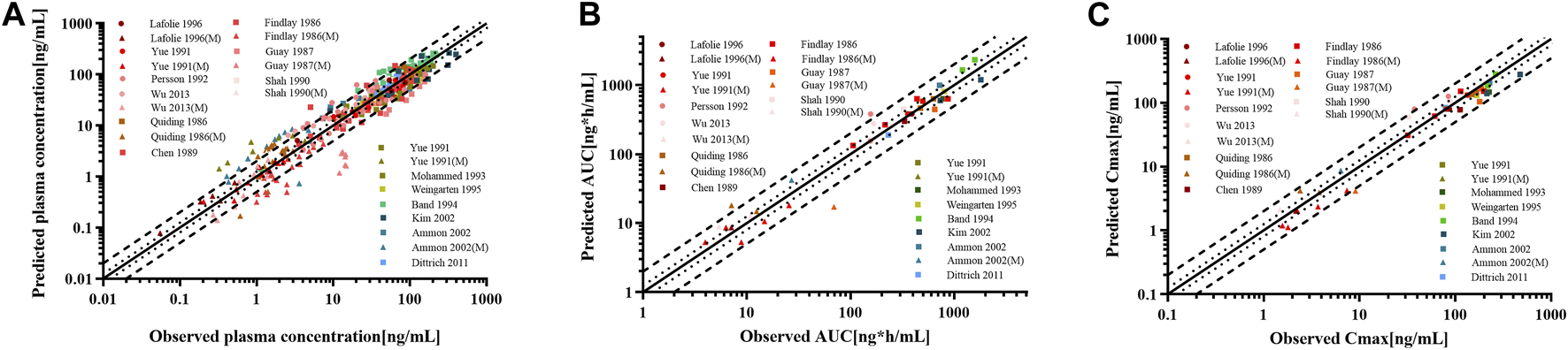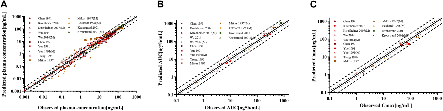 Figure 7. Goodness-of-fit plot for (A) plasma concentrations, (B) AUC0-∞, and (C) Cmax of codeine and morphine in adults with different CYP2D6 phenotypes. The solid line represented the line of identity, and the bold dotted lines and dotted lines represented the 2-fold and 1.25-fold error ranges, respectively. The circles and squares indicated data used for PBPK modeling, building, and evaluation, and the triangle showed data about morphine.