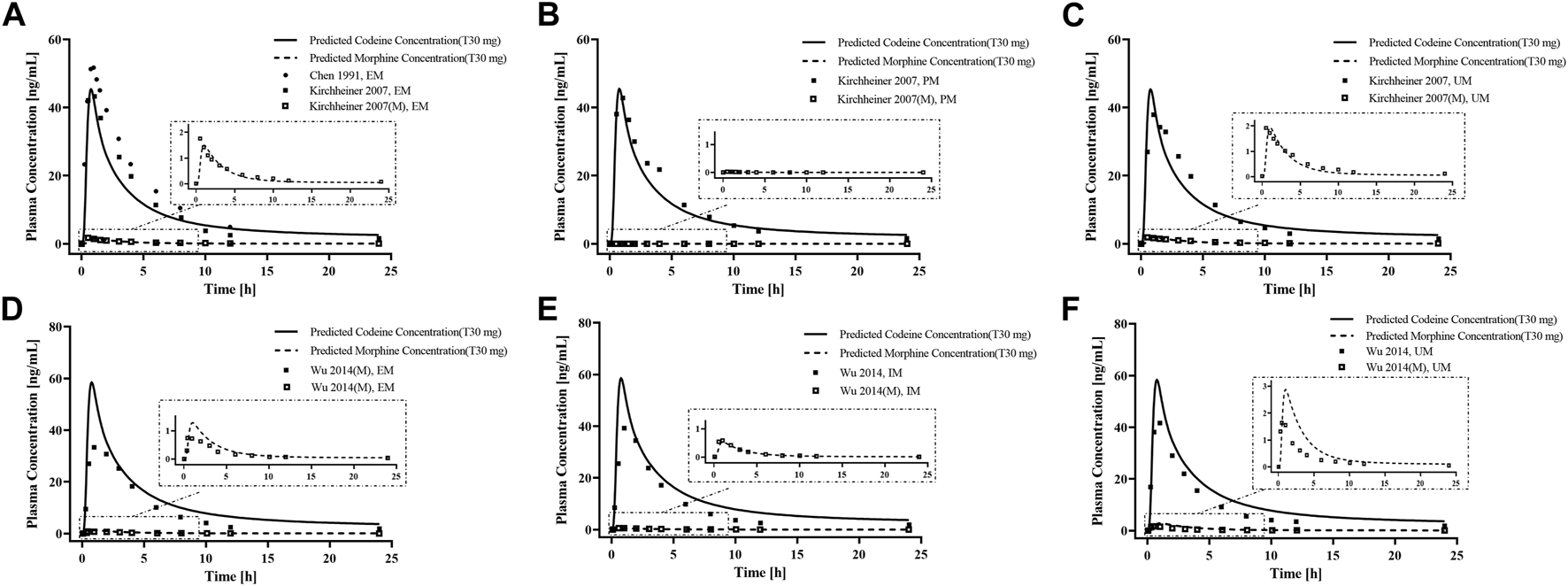 Figure 5. PBPK modeling established in healthy adults with different CYP2D6 phenotypes. Simulation (lines) of PK profiles for a single p. o. administration of 30 mg codeine tablet in a typical American individual with (A) EM type, (B) PM type, and (C) UM type, and p. o. administration of 30 mg codeine tablet in a typical Asian individual with (D) EM type, (E) IM type, and (F) UM type. The observed concentration data were provided as the arithmetic mean values extracted from references. The solid and dotted line represented the predicted codeine and morphine concentrations, respectively.