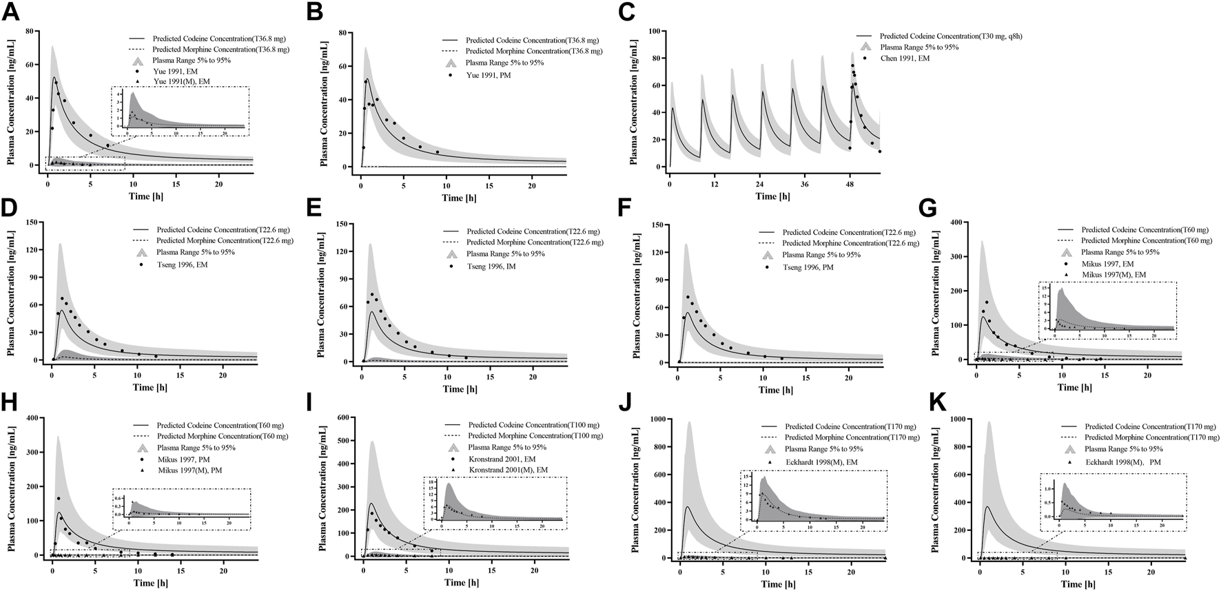 Figure 6. PK profile verification in adults with different CYP2D6 phenotypes. (A–C) p. o. administration at a dose or multiple doses of codeine tablets in Americans with EM and PM types; (D–F) the single p. o. administration of codeine tablets in Asians with EM, IM, and PM types; and (G–K) the single p. o. administration of codeine tablets in Europeans with EM and PM types. The observed concentration data were provided as the arithmetic mean values extracted from references. The solid line and dotted line represented the predicted codeine and morphine concentrations, respectively. The shaded area represented the predicted 5th to 95th percentile range.