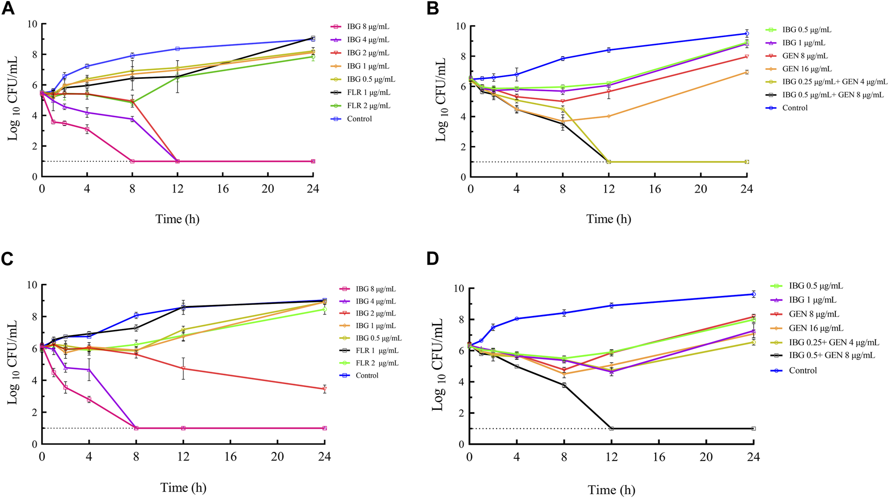 In vitro time-killing curves of IBG alone and in combination with GEN against R. anatipestifer ATCC11845 (A, B) and GDH21D24 (C, D). IBG, isopropoxy benzene guanidine; FLR, florfenicol; GEN, gentamycin.
