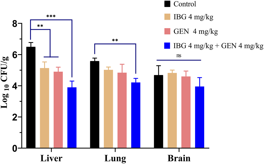 Bacterial loads in the liver, lung, and brain tissues of ATCC11845-infected ducks after treatment with IBG combined with GEN. (ns, not significant, *p < 0.05, **p < 0.01, ***p < 0.001.)