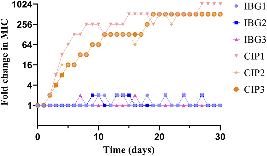 Changes in the MICs of IBG and CIP for R. anatipestifer ATCC 11845 after 30 days of serial passage.