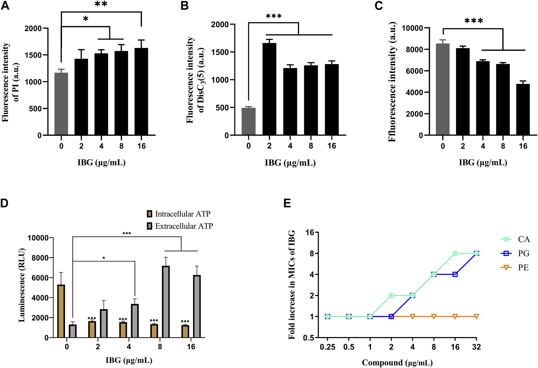 Mechanism of IBG against R. anatipestifer. (A) Increased permeability of the inner membrane of R. anatipestifer ATCC11845 treated with different concentrations of IBG. (B) The fluorescent probe DiSC3(5) was used to detect the membrane potential. (C) ΔpH of R. anatipestifer ATCC11845 treated with IBG was obtained by using BCECF-AM probes (D) Intracellular and extracellular ATP levels in R. anatipestifer ATCC11845 treated with different concentrations of IBG. (E) Antibacterial activity of IBG combined with CA, PG, or PE. All data were expressed as mean ± standard deviation, and significance was determined by nonparametric one-way ANOVA. (ns, not significant, *p < 0.05, **p < 0.01, ***p < 0.001.)
