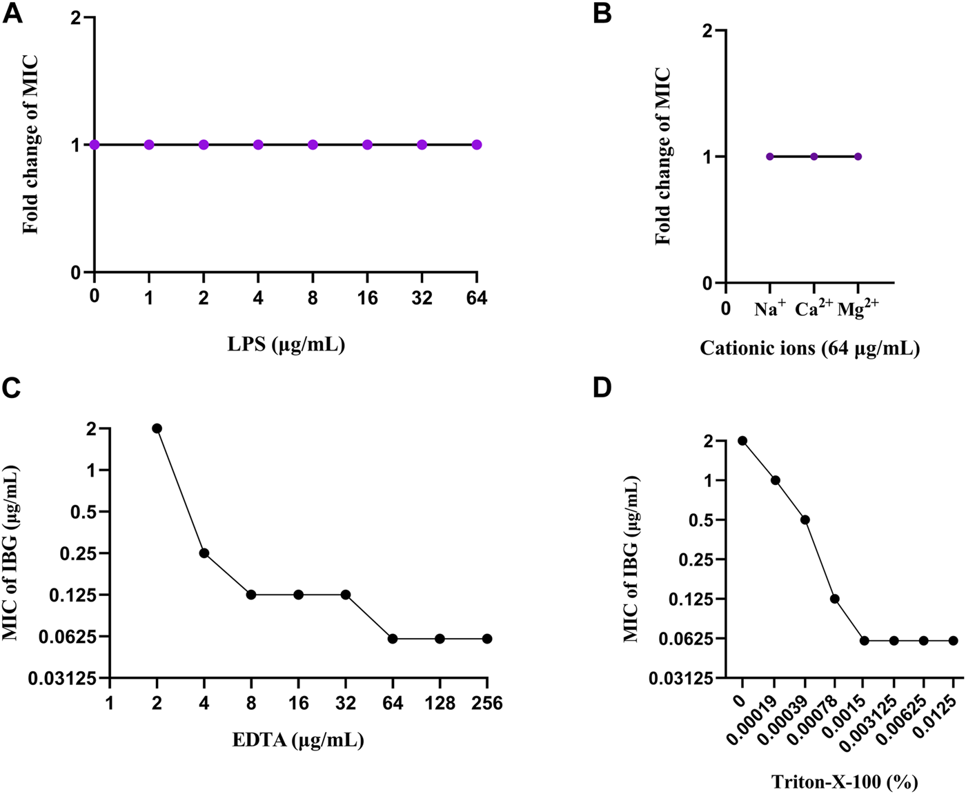 The levels of PE, PG, CA, EDTA, Trixon-X-100, LPS, and different cations (NaCl, CaCl2, and MgCl2) were analyzed by checkerboard assays to understand the effects of exogenous addition on the antibacterial activity of IBG against R. anatipestifer ATCC11845.