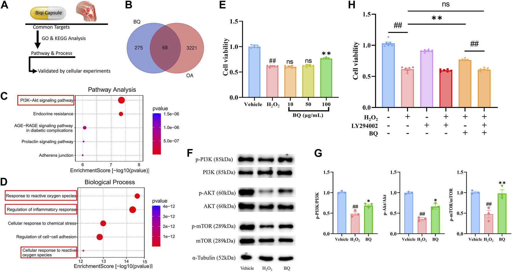 Figure 2. Network pharmacology analysis of Biqi Capsule for treating OA, and validated by H2O2-stimulated SW1353 cells. (A) Process of Network pharmacology prediction and cellular experiments validation. (B) Venn diagram showing overlap of OA genes and predicted compound targets. (C) Kyoto Encyclopedia of Genes and Genomes (KEGG) pathway enrichment analysis. (D) Gene Ontology (GO) analysis of biological processes. (E) SW1353 cells were incubated with H2O2 (260 μmol/L) and Biqi Capsule extract (BQ) for 12 h. Cell viability was determined by the CCK8 test. Data were presented as mean ± SEM. (n = 6, #p < 0.05, ##p < 0.01 compared with the Vehicle group; *p < 0.05, **p < 0.01 compared with the H2O2 group) (F, G) SW1353 cells were incubated with H2O2 (260 μmol/L) and Biqi Capsule extract (BQ) (100 μg/mL) for 12 h. The regulation effect of Biqi Capsule extract on phosphorylation of PI3K, AKT, and mTOR in SW1353 cells was measured by Western Blot analysis. The densitometric analyses of three independent experiments were shown. Data were presented as mean ± SEM. (n = 3, #p < 0.05, ##p < 0.01 compared with the Vehicle group; *p < 0.05, **p < 0.01 compared with the H2O2 group) (H) SW1353 cells were incubated with LY294002 (75 μmol/L) for 4 h and then co-incubated with H2O2 (260 μmol/L) and Biqi Capsule extract (100 μg/mL) for another 12 h. Cell viability was determined by the CCK8 test. Data were presented as mean ± SEM. (n = 6, #p < 0.05, ##p < 0.01 compared with the Vehicle group).