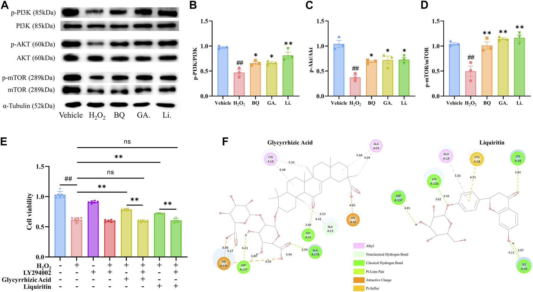Figure 4. Effect of Glycyrrhizic Acid and Liquiritin on H2O2-stimulated SW1353 cells. (A–D) SW1353 cells were incubated with H2O2 (260 μmol/L) and Glycyrrhizic Acid (GA) (5 μmol/L)/Liquiritin (Li.) (5 μmol/L) for 12 h. The regulation effect of Biqi Capsule extract (BQ), Glycyrrhizic Acid, and Liquiritin on phosphorylation of PI3K, AKT, and mTOR in SW1353 cells was measured by western blot analysis. The densitometric analyses of three independent experiments were shown. Data were presented as mean ± SEM. (n = 3, #p < 0.05, ##p < 0.01 compared with the Vehicle group; *p < 0.05, **p < 0.01 compared with the H2O2 group) (E) SW1353 cells were incubated with LY294002 (75 μmol/L) for 4 h and then co-incubated with H2O2 (260 μmol/L) and Glycyrrhizic Acid (5 μmol/L)/Liquiritin (5 μmol/L) for another 12 h. Cell viability was determined by the CCK8 test. Data were presented as mean ± SEM. (n = 6, #p < 0.05, ##p < 0.01 compared with the Vehicle group) (F) Docking structure of active compounds with RAC1.