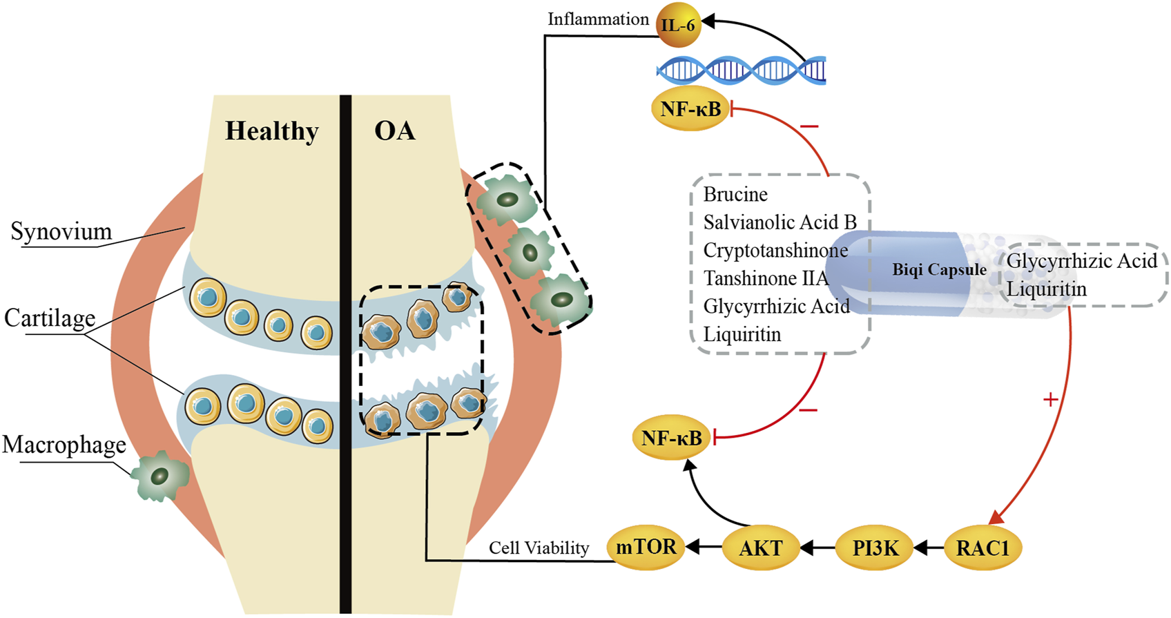 • Biqi Capsule exerts its chondroprotective effect by activating the PI3K/AKT/mTOR pathway in chondrocytes and an anti-inflammatory effect by inhibiting the NF-κB/IL-6 pathway.