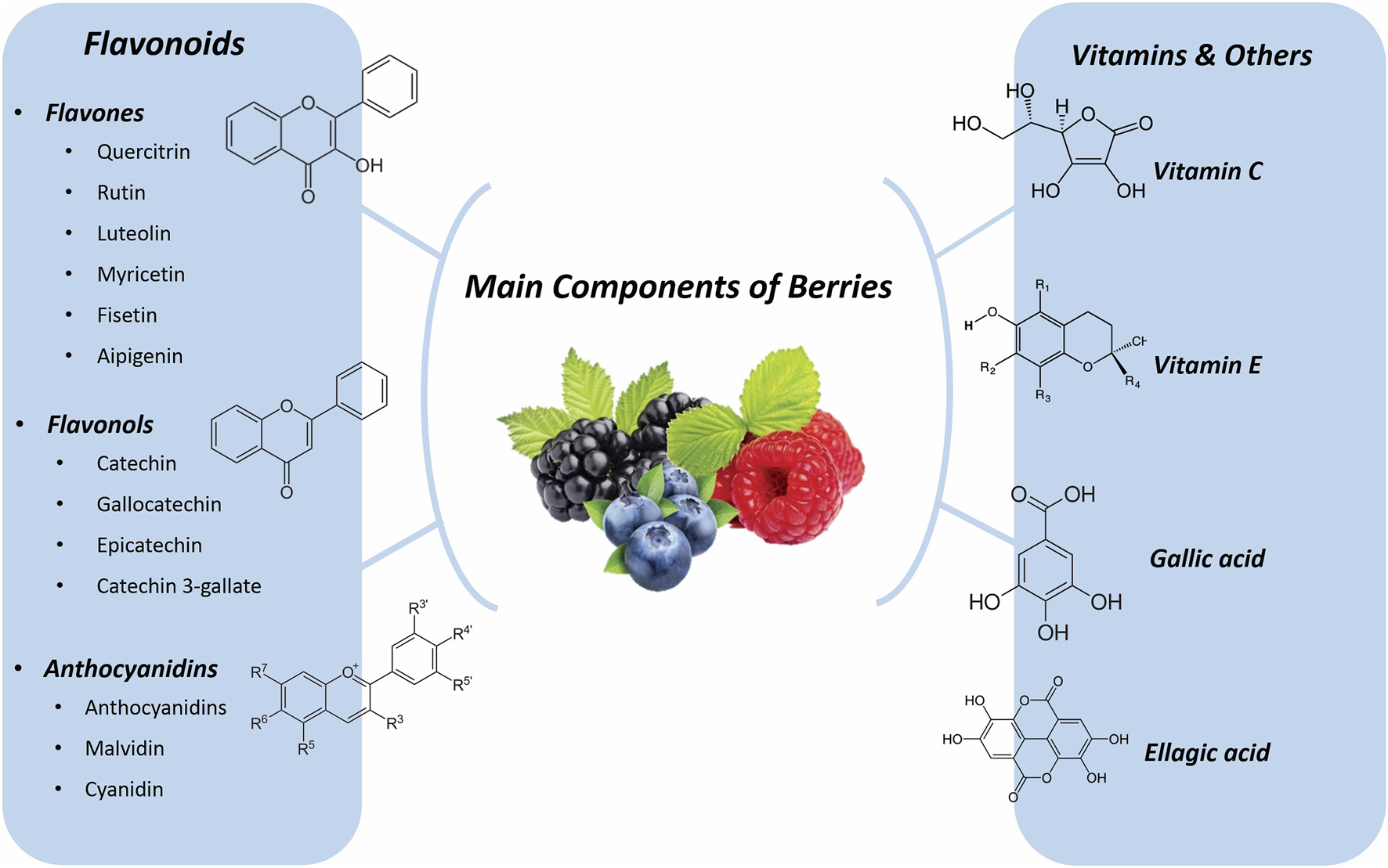A variety of phenolic acids (including GA, p-hydroxybenzoic acid, protocatechuic acid, caffeic acid, vanillic acid, p-coumaric acid, EA, ferulic acid, and cinnamic acid) and various flavonoids were present in the blueberry, strawberry, and blackberry samples tested (flavone: luteolin; flavonols: myricetin, quercitrin, rutin, and quercetin; flavanols: epigallocatechin, gallocatechin, catechin, and catechin gallate; anthocyanidins: cyanidin, malvidin-3-glucoside, and malvidin-3-galactoside). Anthocyanidins and proanthocyanidin levels were exceptionally high in blueberries, which may be the reason for their potent antioxidant properties (Huang et al., 2012).