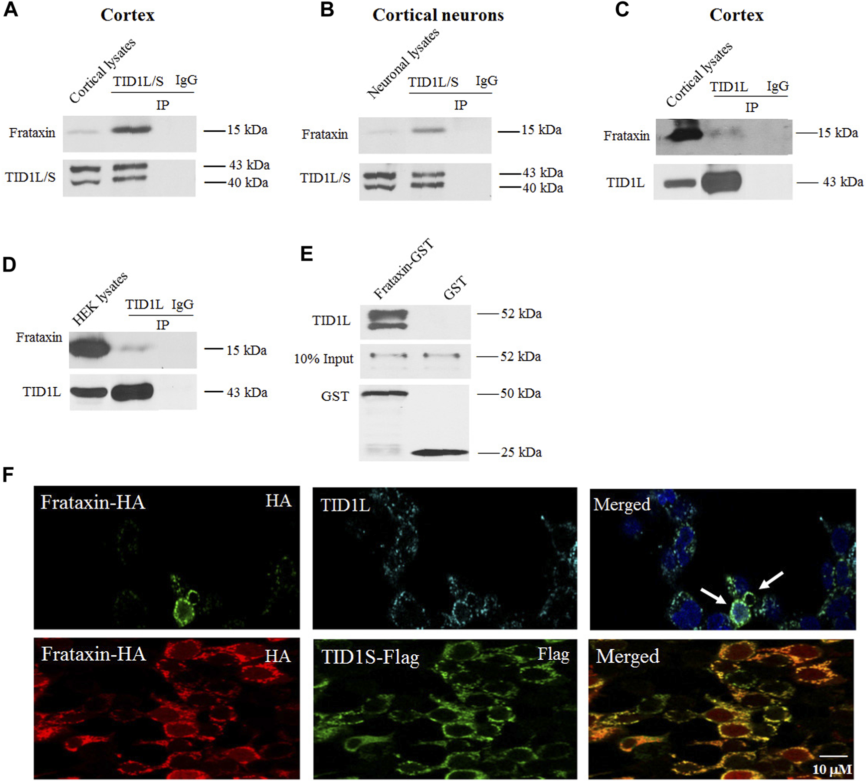 TID1 physically interacts with frataxin both in vivo in mouse cortex and in vitro in cortical neurons. In both cortical homogenates (A) and neuronal lysates (B), frataxin was immunoprecipitated by a TID1L/S antibody but not control IgG. Similarly, a specific TID1L antibody but not control IgG immunoprecipitated frataxin from cortical homogenates (C) and HEK293 cells (D) but to a much lesser extent. In an in vitro binding assay, purified glutathione S- transferase (GST)-frataxin but not purified GST pulled down TID1L (E). In HEK293 cells transfected with frataxin-HA and TID1S-Flag, immunofluorescence was performed using anti-HA and anti-Flag antibodies. Frataxin colocalized with TID1S (F). Frataxin also colocalized with endogenously expressed TID1L stained with an anti-TID1L antibody (F), further supported the interaction between TID1 and frataxin.