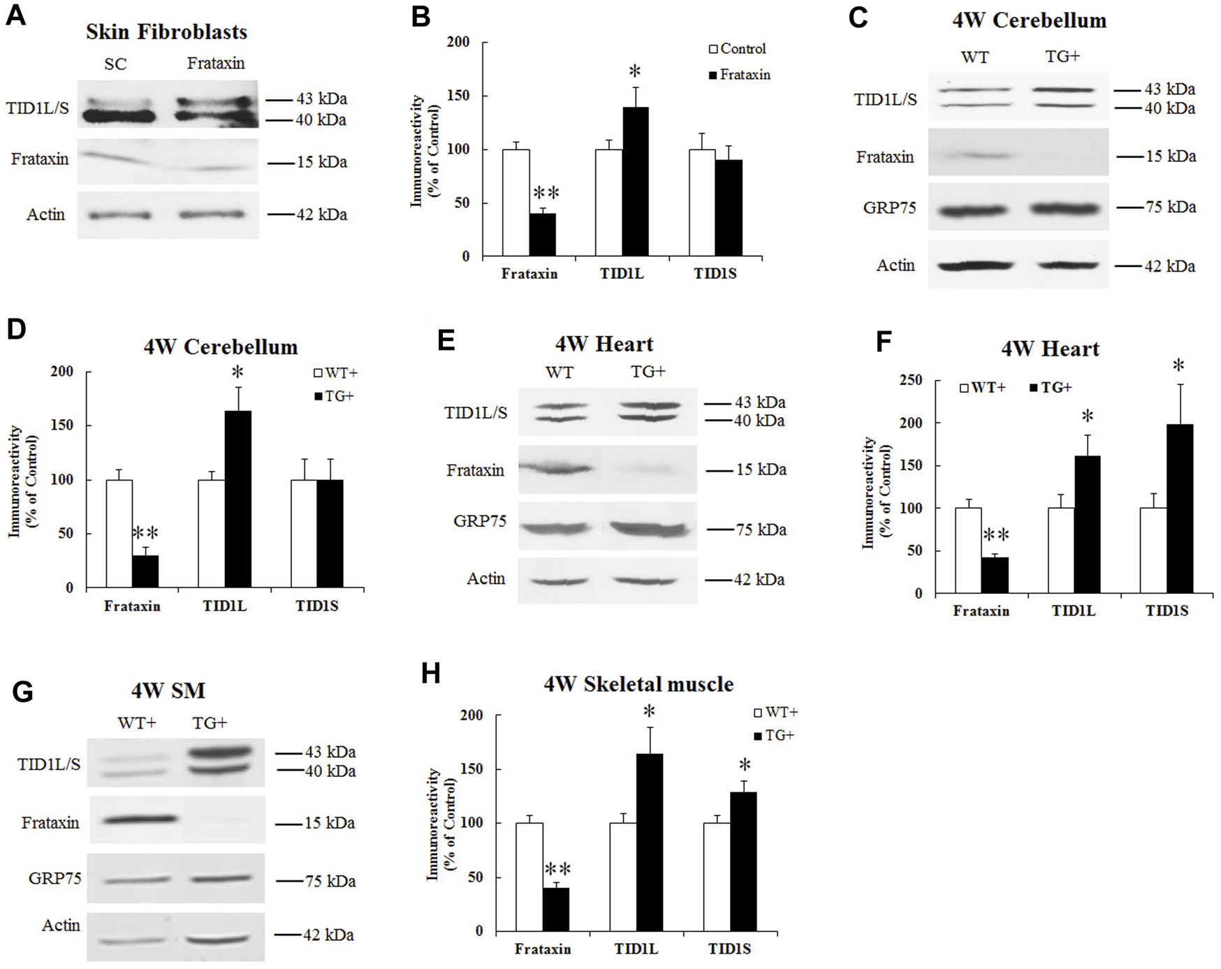 Effect of frataxin knockdown on TID1 protein levels. Representative blots and bar graph show decreased frataxin and increased TID1 protein levels in human skin fibroblasts transfected with frataxin siRNA for 3 days (A,B) (n = 6) as well as in the homogenates of cerebellum (C,D) (n = 6), heart (E,F) (n = 6) and skeletal muscle (G,H) (n = 6) from frataxin knockdown mice induced with doxycycline for 4 weeks. *p < 0.05, **p < 0.01. Data were shown as mean ± SE.