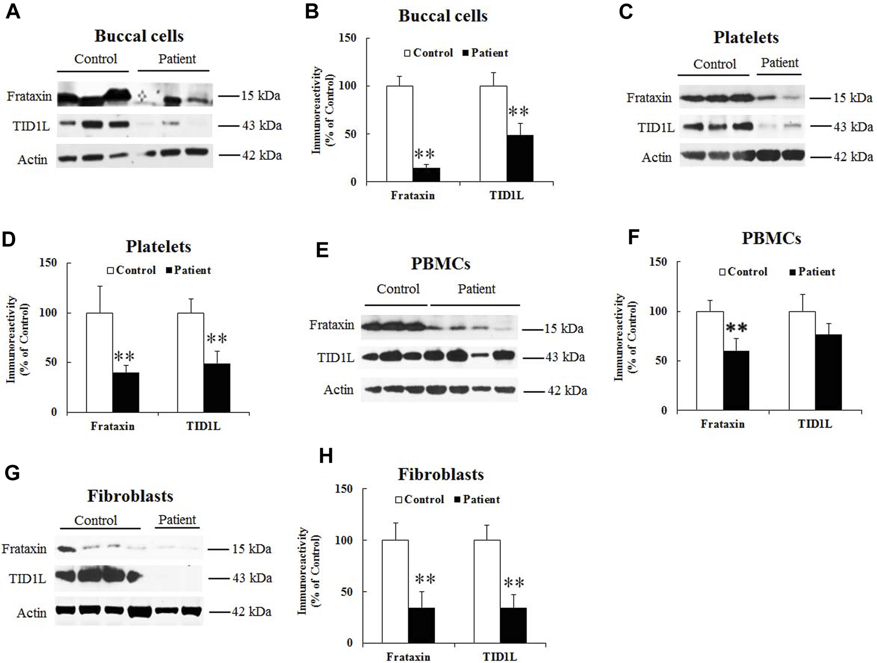 We then examined TID1 protein in FRDA patient-derived cells. Due to the low expression level of TID1S in buccal cells, platelets and PBMCs (Supplementary Figure S2), only TID1L was measured in patient cells. Compared with healthy individuals, frataxin levels significantly decreased in buccal cells (Figures 3A, B, 78% decrease, n = 14 for control and n = 16 for patient, p < 0.01), platelets (Figures 3C, D, 60% decrease, n = 15 for control and n = 20 for patient, p < 0.01), PBMCs (Figures 3E, F, 47% decrease, n = 18 for both control and patient, p < 0.01) and fibroblasts (Figures 3G, H, 65% decrease, n = 16–17 both control and patient, p < 0.01). Accordingly, TID1L levels were significantly decreased in buccal cells (Figures 3A, B, 60% decrease, n = 14 for control and n = 16 for patient, p < 0.01), platelets (Figures 3C, D, 51% decrease, n = 15 for control and n = 20 for patient, p < 0.01) and fibroblasts (Figures 3G, H, 65% decrease, n = 16–17 both control and patient, p < 0.01). No change in TID1L was detected in PBMCs (Figures 3E, F). These results indicate that TID1L is reduced in FRDA patient-derived cells.