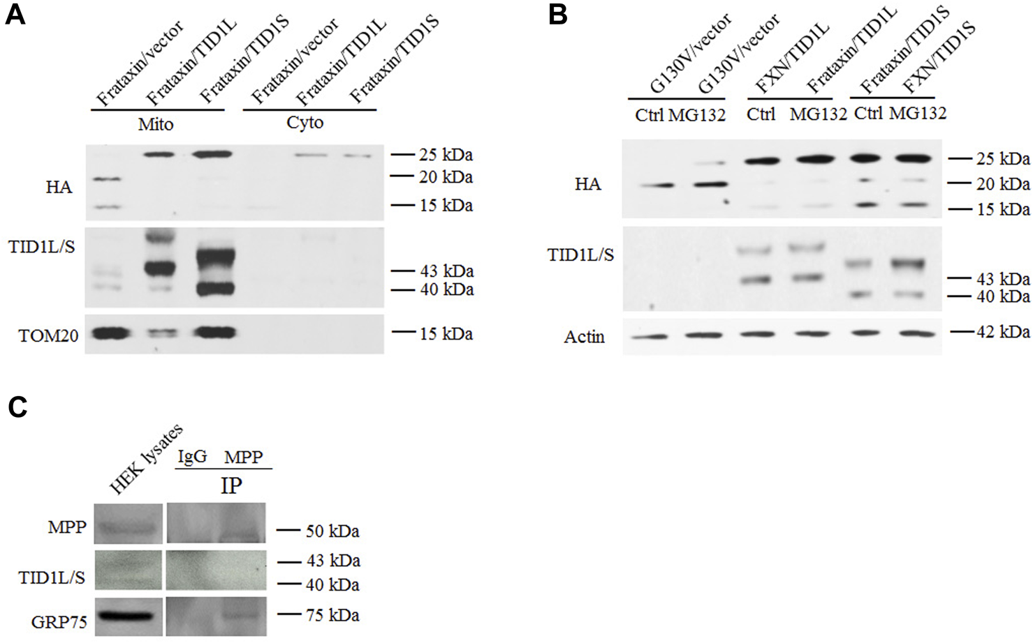 Mechanistic study of TID1 overexpression-caused changes in frataxin levels. HEK293 cells transfected with frataxin and TID1 plasmid DNAs were subject to mitochondria fractionation followed by Western blotting analysis. Frataxin precursor is predominantly localized in the mitochondrial fraction upon TID1L or TID1S overexpression (A). Tom20 was used as a mitochondrial marker (A). Treatment with MG132 (10 μM) also had no effect on TID1L or TID1S overexpression-caused decrease in intermediate and mature frataxin (B). Frataxin G130V mutant transfected HEK293 cells were used as a positive control (B). Neither TID1L nor TID1S interacted with MPP, in contrast to GRP75 (C).
