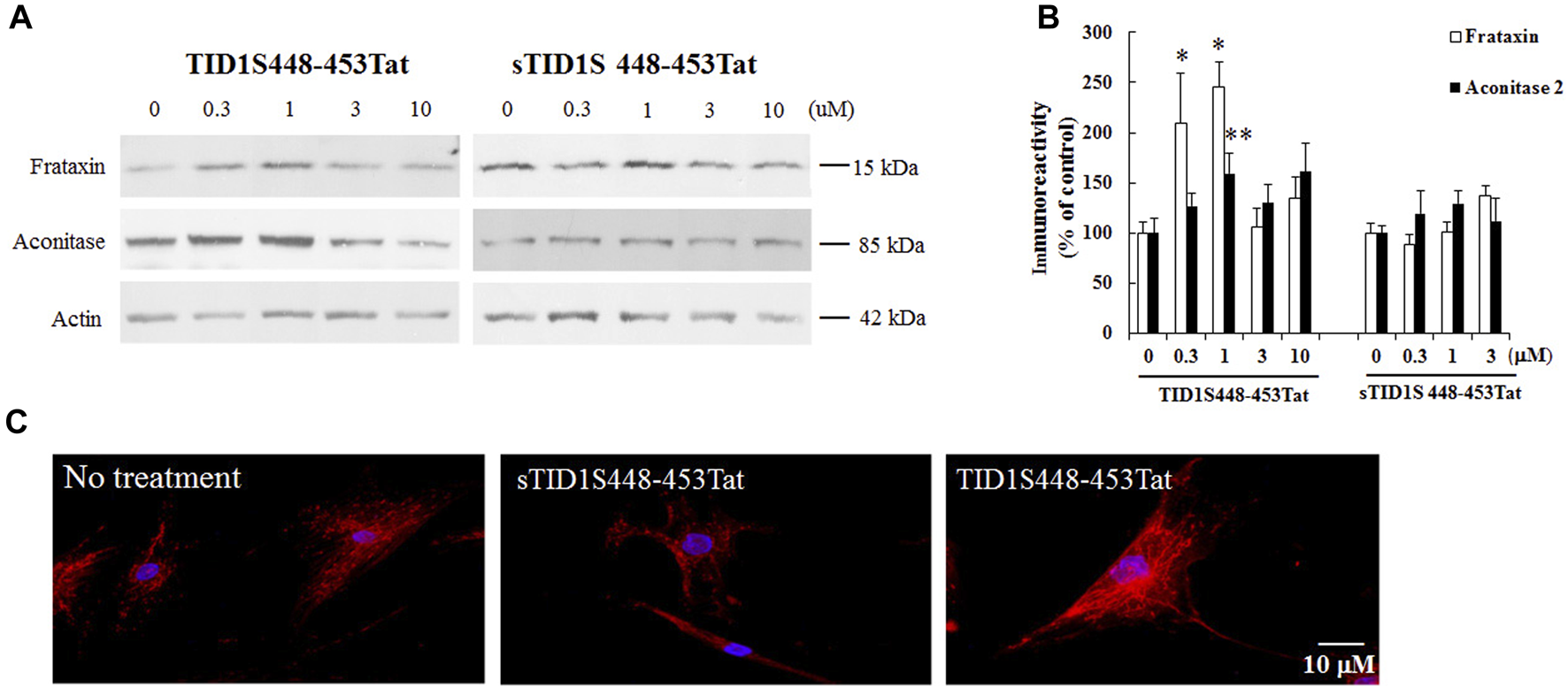TID1S and TID1L only differ in the C-terminus. TID1L has 33 amino acids unique to its C-terminus while TID1S contains 6 amino acids (Lu et al., 2006). To investigate whether the effect of TID1S on frataxin is mediated by the last 6 amino acids of its C-terminus (448-453), we generated a competing peptide based on the amino acid sequence of TID1S448-453. To make the TID1S448-453 peptide permeable to cell membranes, it was coupled with a peptide from the transactivator of transcription (TAT) of human immunodeficiency virus (Liu et al., 2008). As a negative control, scrambled TID1S448-453 (sTID1S448-453) was also produced. FRDA patient-derived skin fibroblasts were treated with both peptides for 48 h followed by Western blot analysis. In comparison with sTID1S448-453Tat, TID1S448-453Tat dose dependently increased frataxin levels with maximal effect achieved at 1 μM (Figures 7A, B) (146% increase, n = 5, p < 0.05). 1μM TID1S448-453Tat also significantly increased aconitase levels (Figures 7A, B) (59% increase, n = 5, p < 0.01) and rescued mitochondrial fractionation (Figure 7C) in FRDA patient fibroblasts.