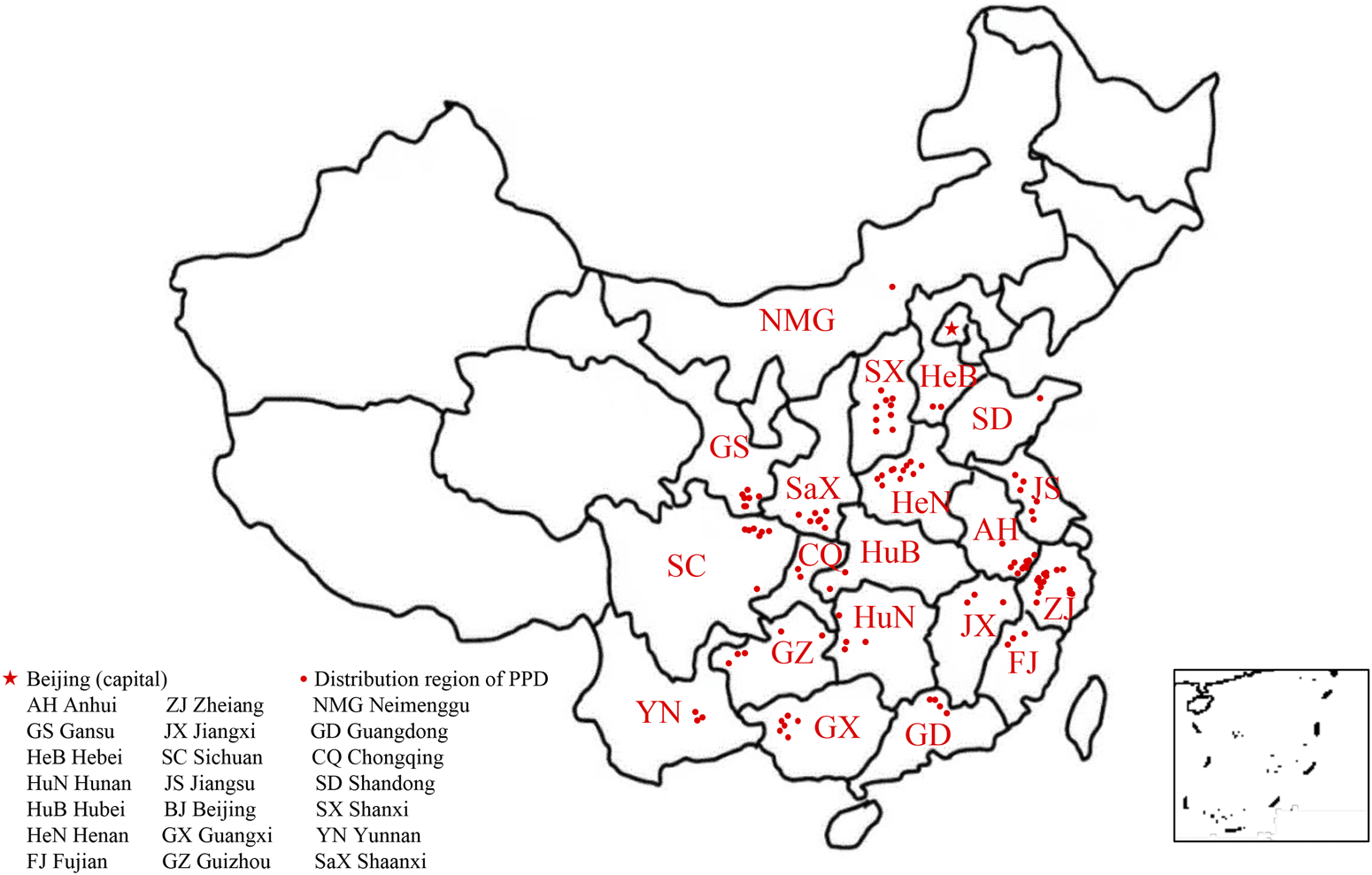 The natural distribution of Peucedanum praeruptorum Dunn across southern China.