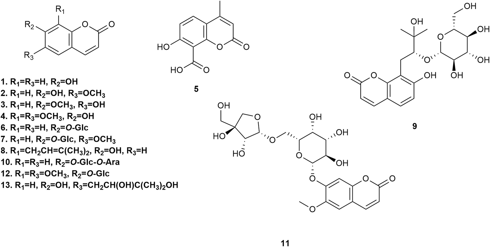 | 8-carboxy-7-hydroxy coumarin 5 | Root | OHPLCc18/c30, NMR, EIMS | Water | Ishii et al. (2008) | |