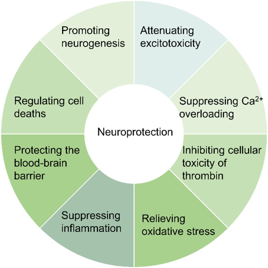 The neuroprotective efficacy of Chinese herbal medicine flavonoids. The botanical medicine flavonoids play a neuroprotective role by decreasing excitotoxicity, Ca2+ overloading, oxidative stress, inflammation, thrombin toxicity, and cell deaths, and protecting BBB and neurogenesis.